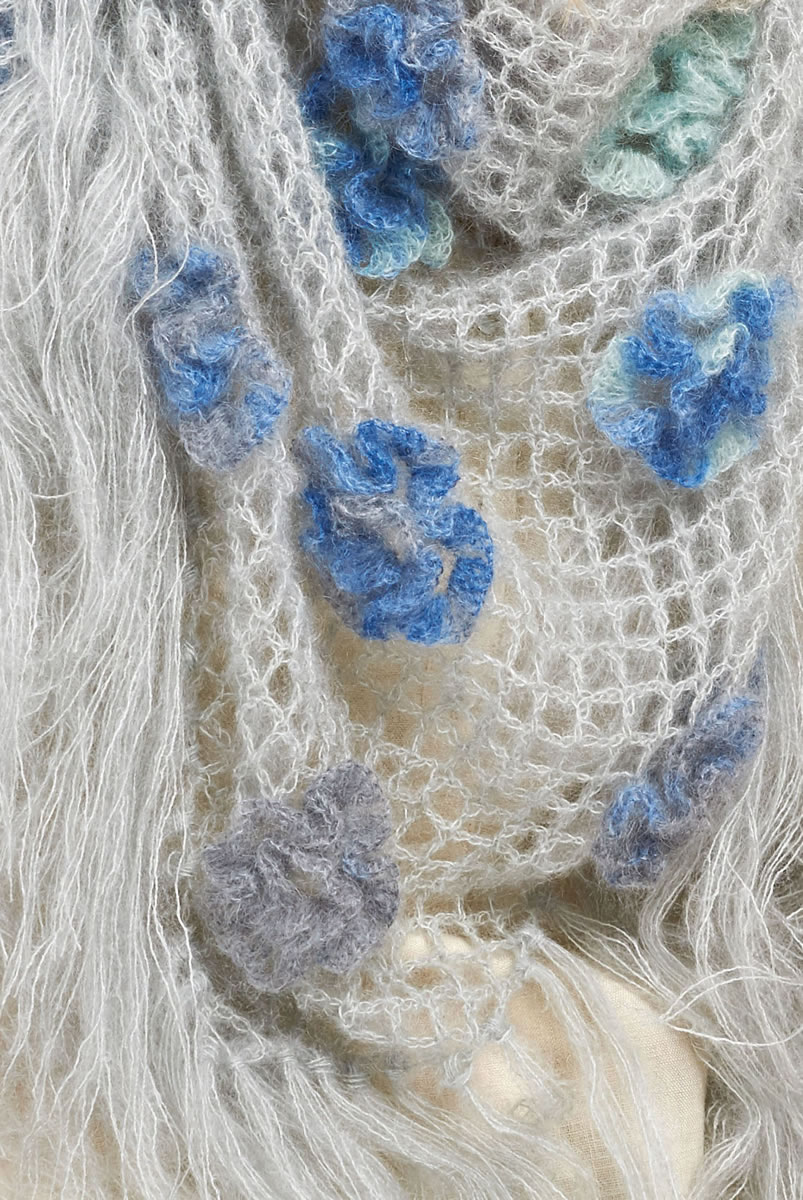 100 g of Lana Grossa Silkhair (70% superkid mohair, 30% silk; 210 m/25 g) in Green-Grey (col 81) and 50 g of Lana Grossa Silkhair Print (70% superkid mohair, 30% silk; 400 m/50 g) in Light Blue/Mint/Grey-Beige/Dark Grey (col 347). Size 4.5 mm crochet hook.
