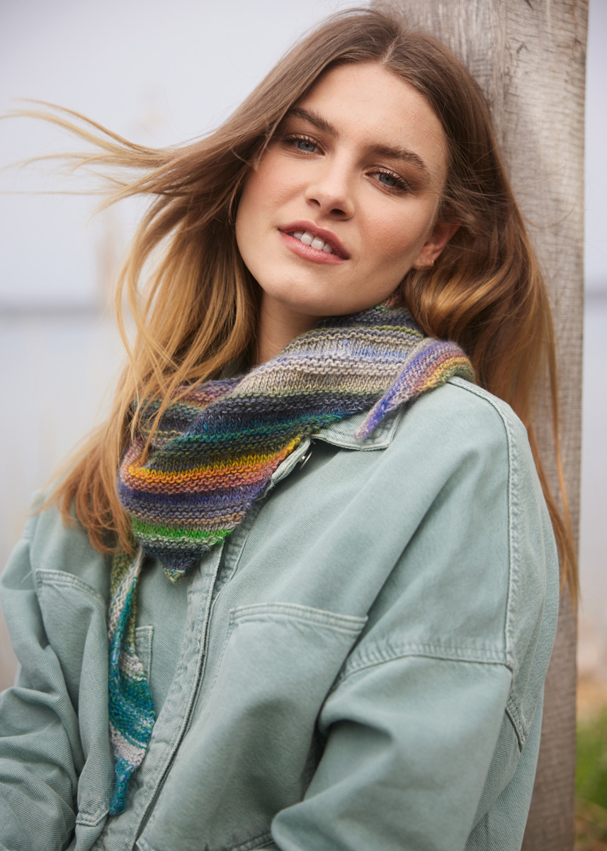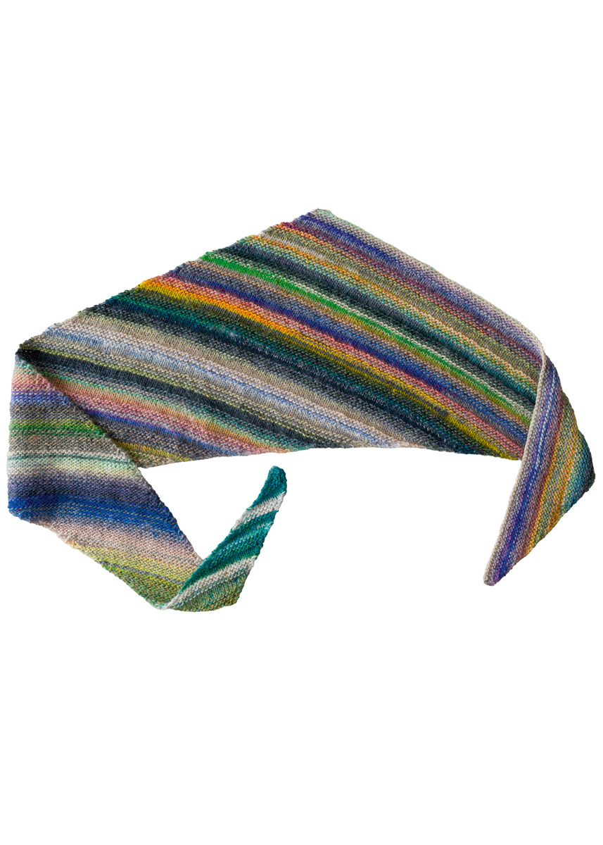100 g of Lana Grossa Colorissimo (100% extrafine Merino wool; 300 m/100 g) in Olive/Yellow/Orange/Violet/ Grey Purple/Light Green/Turquoise/Pink/Fuchsia/Wine (col 201). Size 5 mm needles.