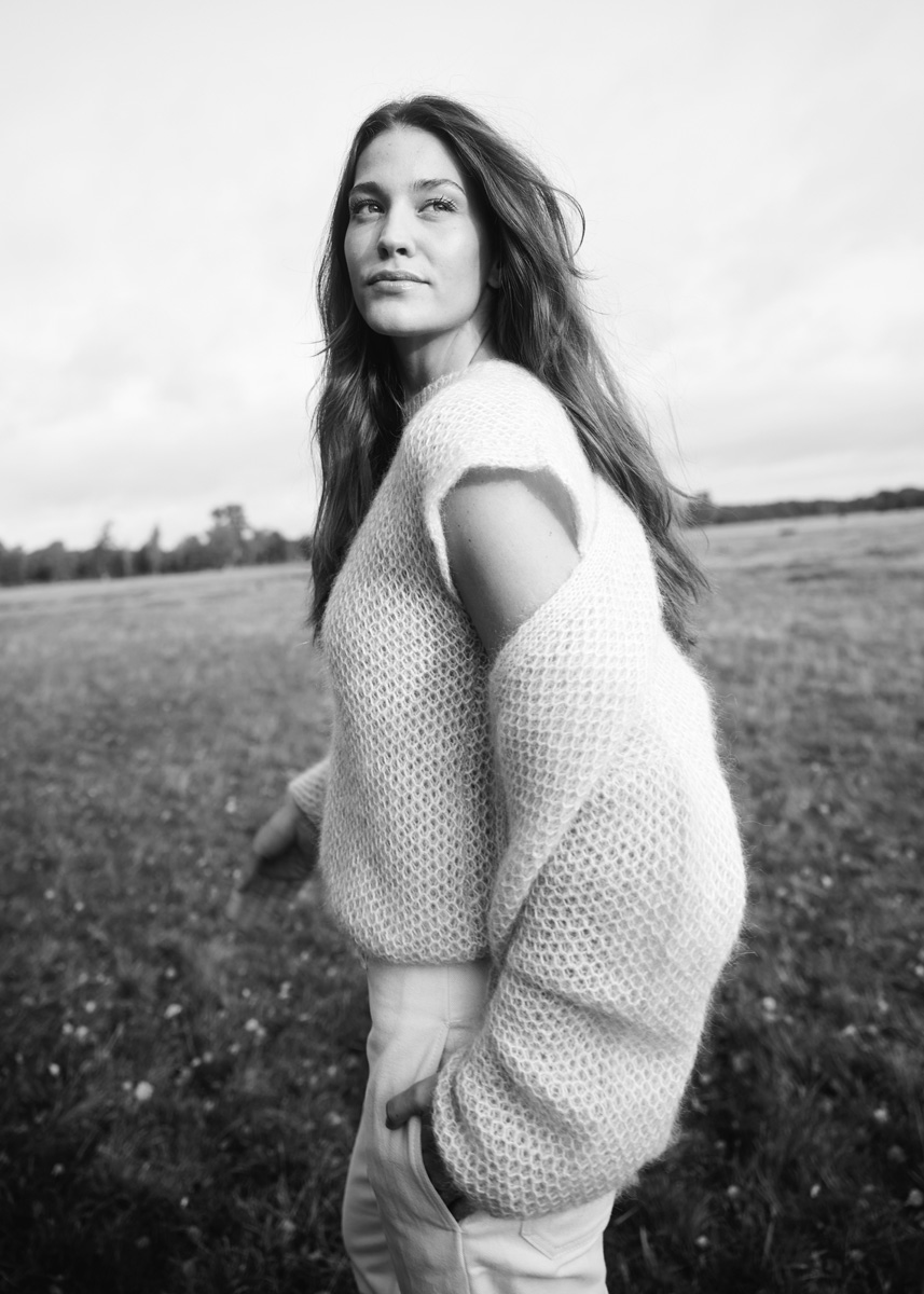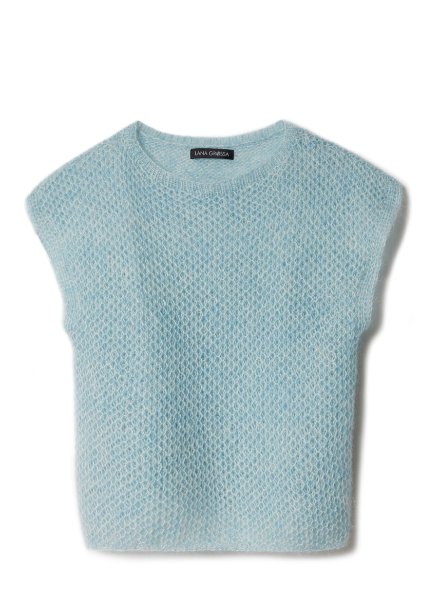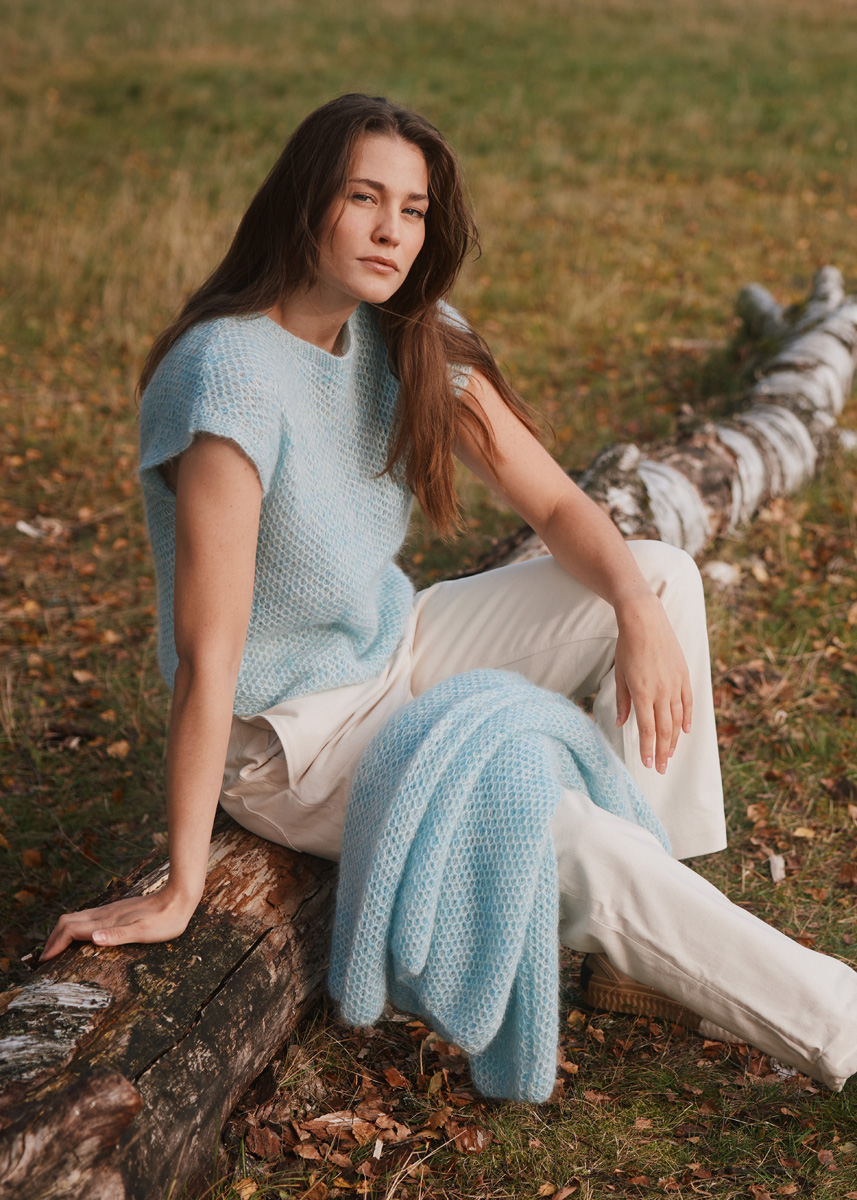 50 (75, 75, 100) g of Lana Grossa Bella (35% cotton, 30% nylon, 25% baby alpaca, 10% Merino wool; 250 m/25 g) in Aquamarine (col 22) and 75 (100, 100, 125) g of Lana Grossa Silkhair (70% superkid mohair, 30% silk; 210 m/25 g) in Off White (col 52). Size 4.5 mm needles; short size 3 mm circular needle.