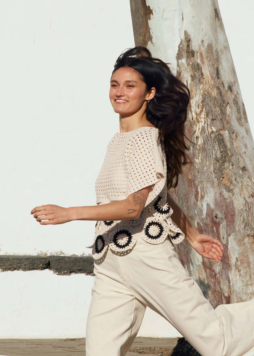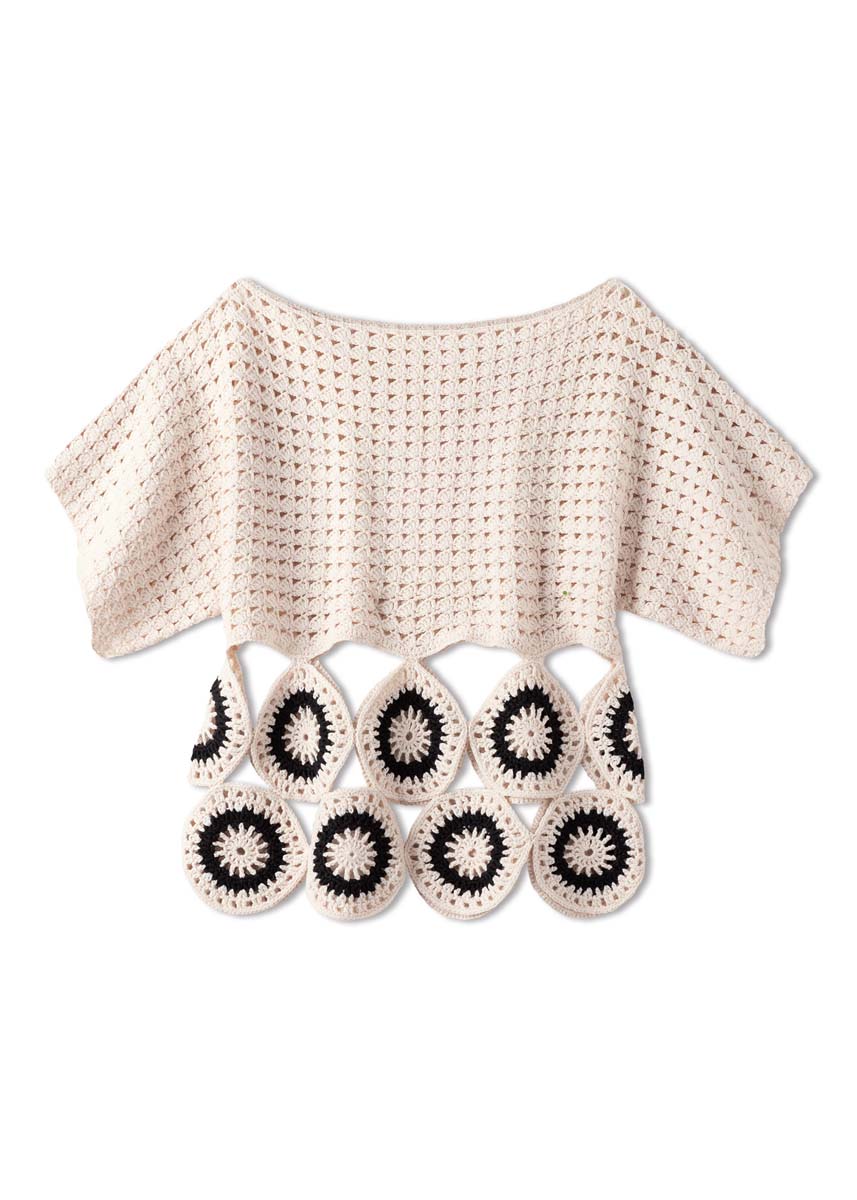 300 g of Lana Grossa Campo (65% cotton, 25% viscose, 10% linen; 165 m/50 g) in Cream (col 2) and 100 g in Black (col 24). Size 3 mm crochet hook.