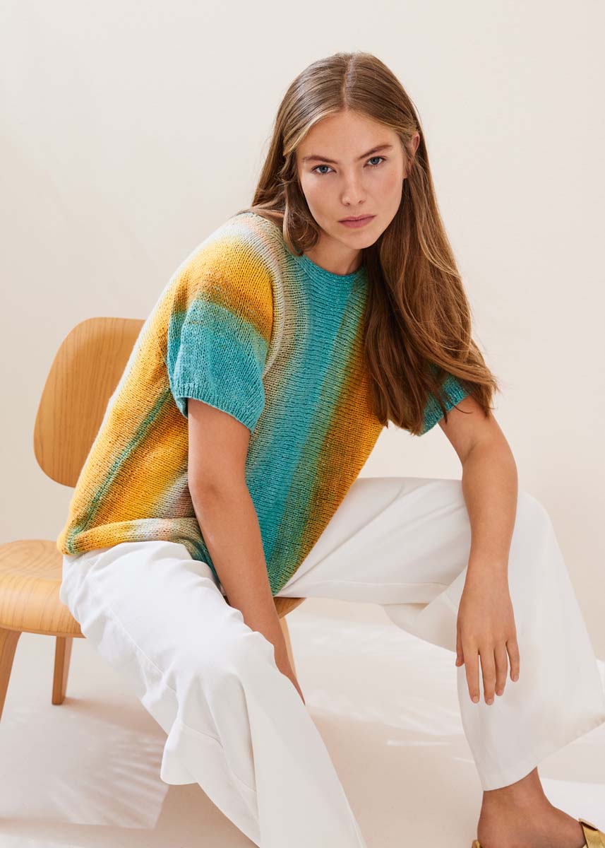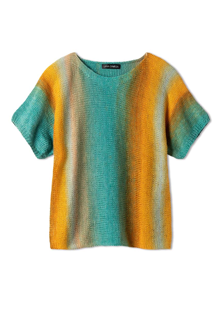 300 (300, 400, 400) g of Lana Grossa Cotonella (100% Pima cotton; 280 m/100 g) in Grey Green/Brown/Gold/ Sun Yellow/Pastel Blue/Peach/Green Beige/Turquoise (col 14). Size 4 mm needles; long size 5 mm circular needle