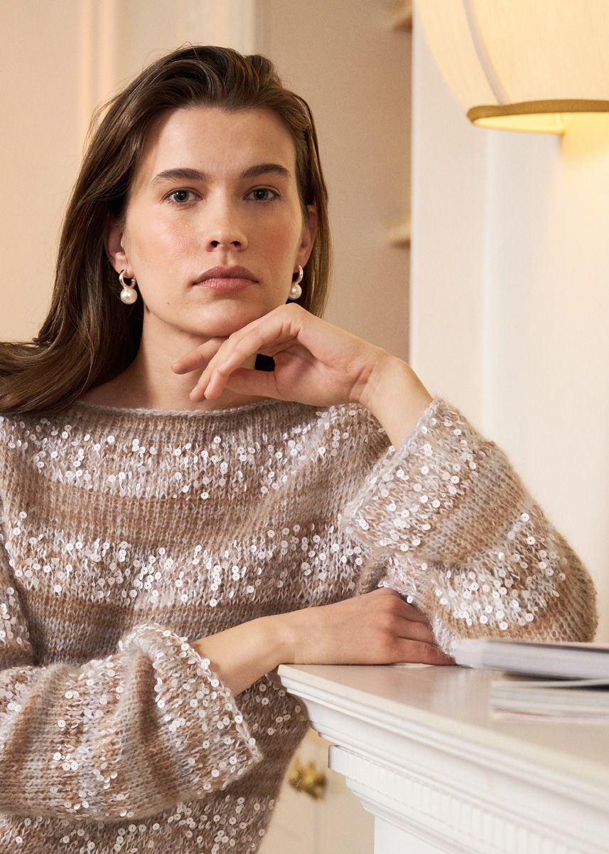 150 (175, 200, 225) g of Lana Grossa Superkid Seta (65% superkid mohair, 35% silk; 100 m/25 g) in Cream/ Beige/Silver Grey (col 101); 200 (200, 200, 200) g of Lana Grossa Cosmo (100% cotton (with sequins); 260 m/100 g) in White (col 1). Short and long size 4.5 and 5.5 mm circular needle; stitch markers.