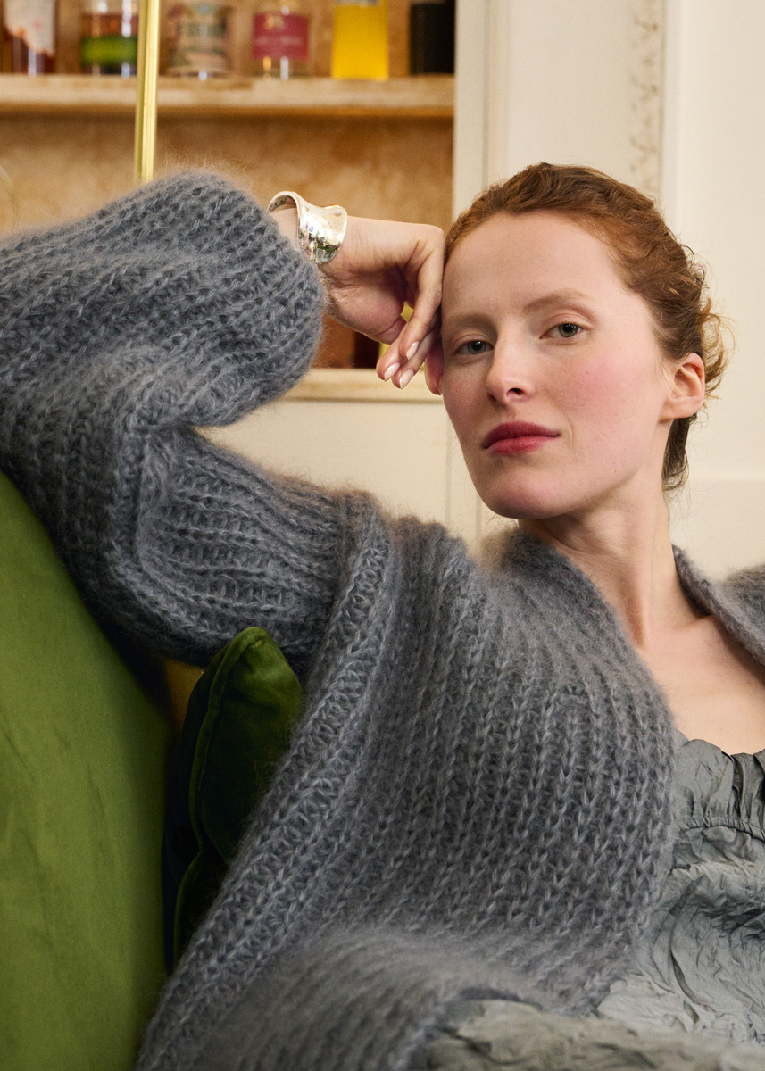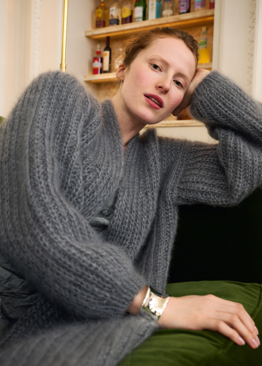 275 (300, 325, 350) g of Lana Grossa Superkid Seta (65% superkid mohair, 35% silk; 100 m/25 g) in Dark Grey (col 21); 300 (325, 350, 375) g of Lana Grossa Silkhair (70% superkid mohair, 30% silk; 210 m/25 g) in Dark Grey (col 12). Size 7 and 8 mm needles.