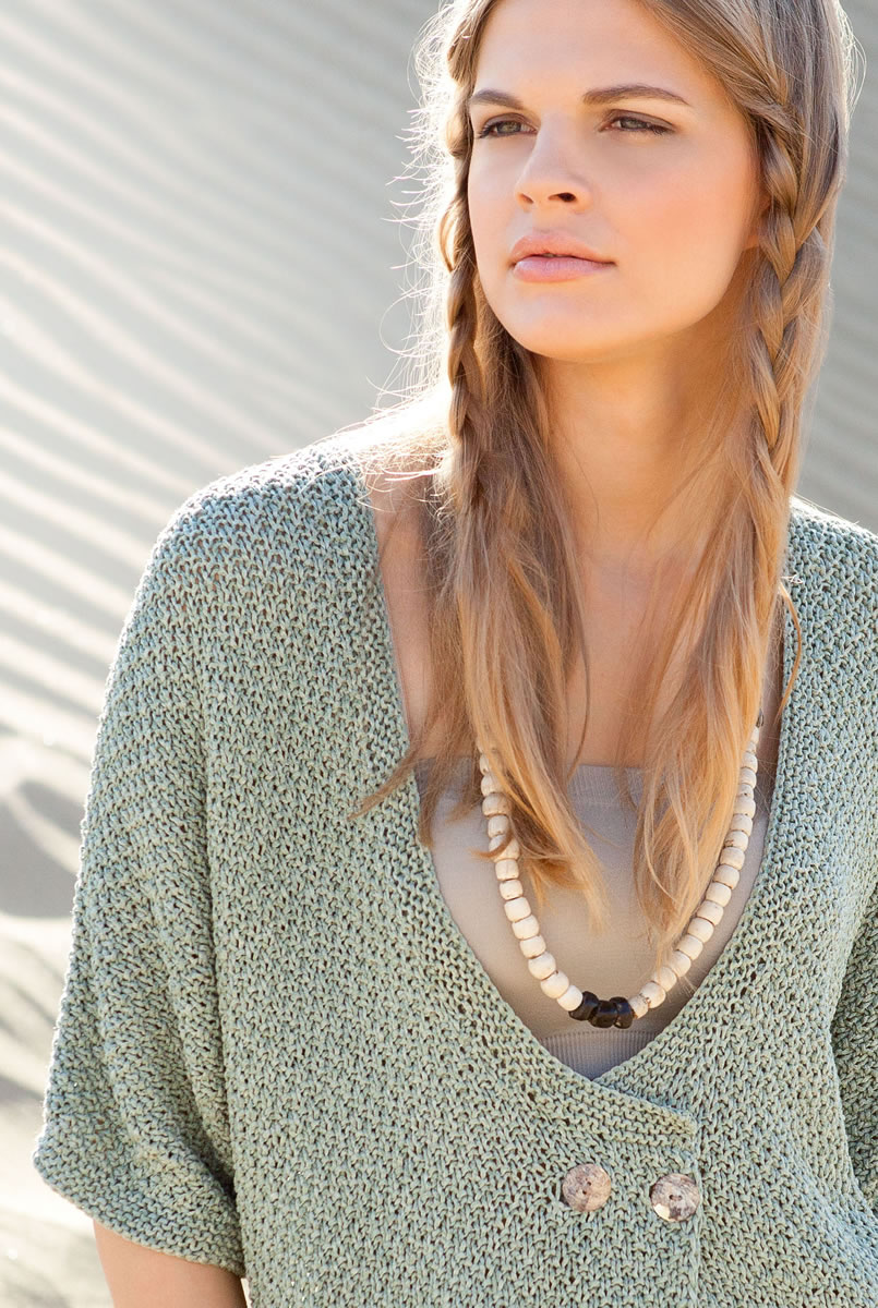 450 (500, 550) g of Lana Grossa Solo Lino Mélange (80% recycled linen (viscose), 20% linen; 105 m/50 g) in Grey-Green Melange (col 109). Size 5 mm needles; size 4.5 and 5 mm circular needles, each 80 cm long; two 23 mm mother-of-pearl buttons [by Union Knopf, item 37604, col 12 natural].