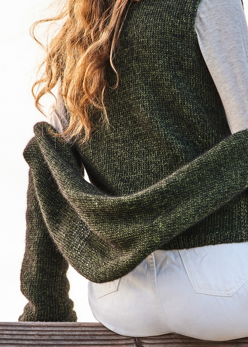 150 (150, 200) g of Lana Grossa Puno Due (63% cotton, 37% baby alpaca; 210 m/50 g) in Olive/Black (col 10). Size 4 mm needles