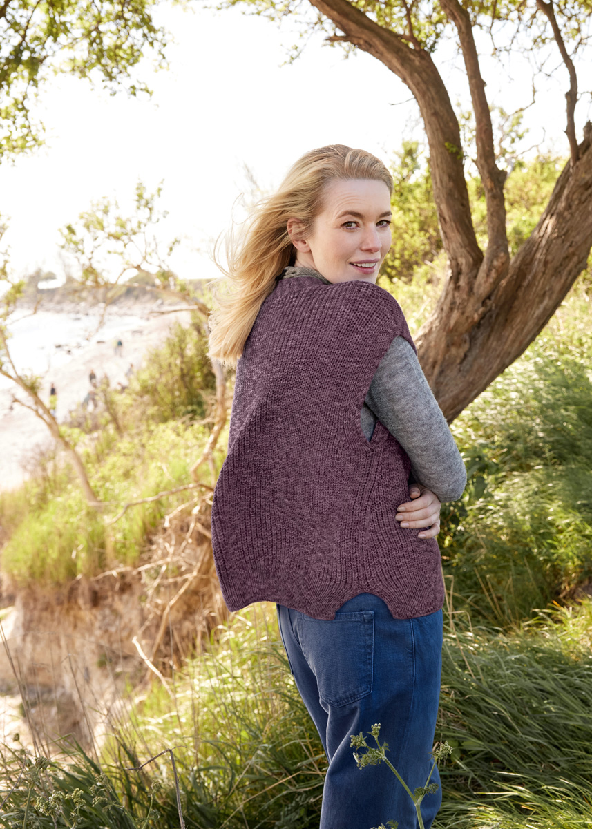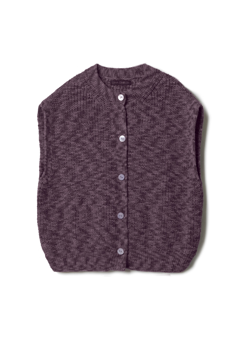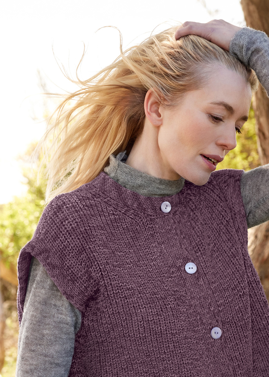 500 (550, 550, 600) g of Lana Grossa Cool Wool Vintage (100% extrafine Merino wool; 160 m/50 g) in Antique Violet (col 7387). Size 3 and 3.5 mm needles; five 20 mm buttons.