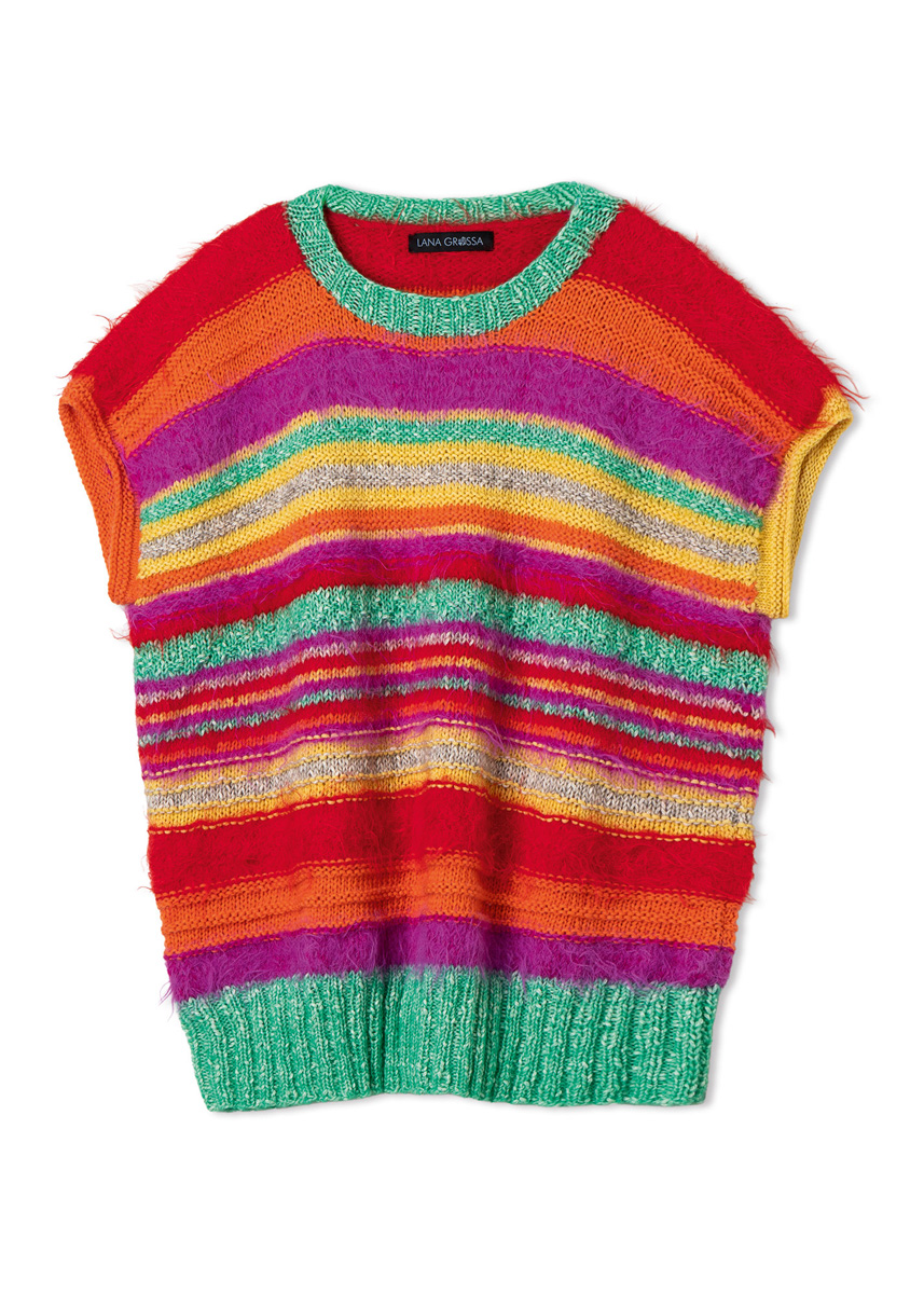 Lana Grossa „Basta“ (50 % Polyamide, 50 % Virgin wool Merino, approx. 100 m/50 g): approx. 100 (100 - 150 - 150) g luminous red (col 27) and approx. 100 (100 - 150 - 150) g pink (col 10); Lana Grossa „Bottoni“ (53 % Cotton, 24 % Viscose, 23 % Virgin wool Merino, approx. 125 m/50 g): approx. 150 (150 - 150 - 200) g jade/raw white (col 10) and approx. 50 (50 - 50 - 50) g gray beige/cream (col 13); Lana Grossa „Summer Softness“ (80 % Cotton, 20 % Virgin wool Merino, approx. 130 m/50 g): approx. 100 (100 - 150 - 150) g pumpkin (col 6) and approx. 50 (100 - 100 - 100) g yellow (col 11); knitting needles size 4 mm and 6 mm; 1 short circular knitting needle size 4 mm