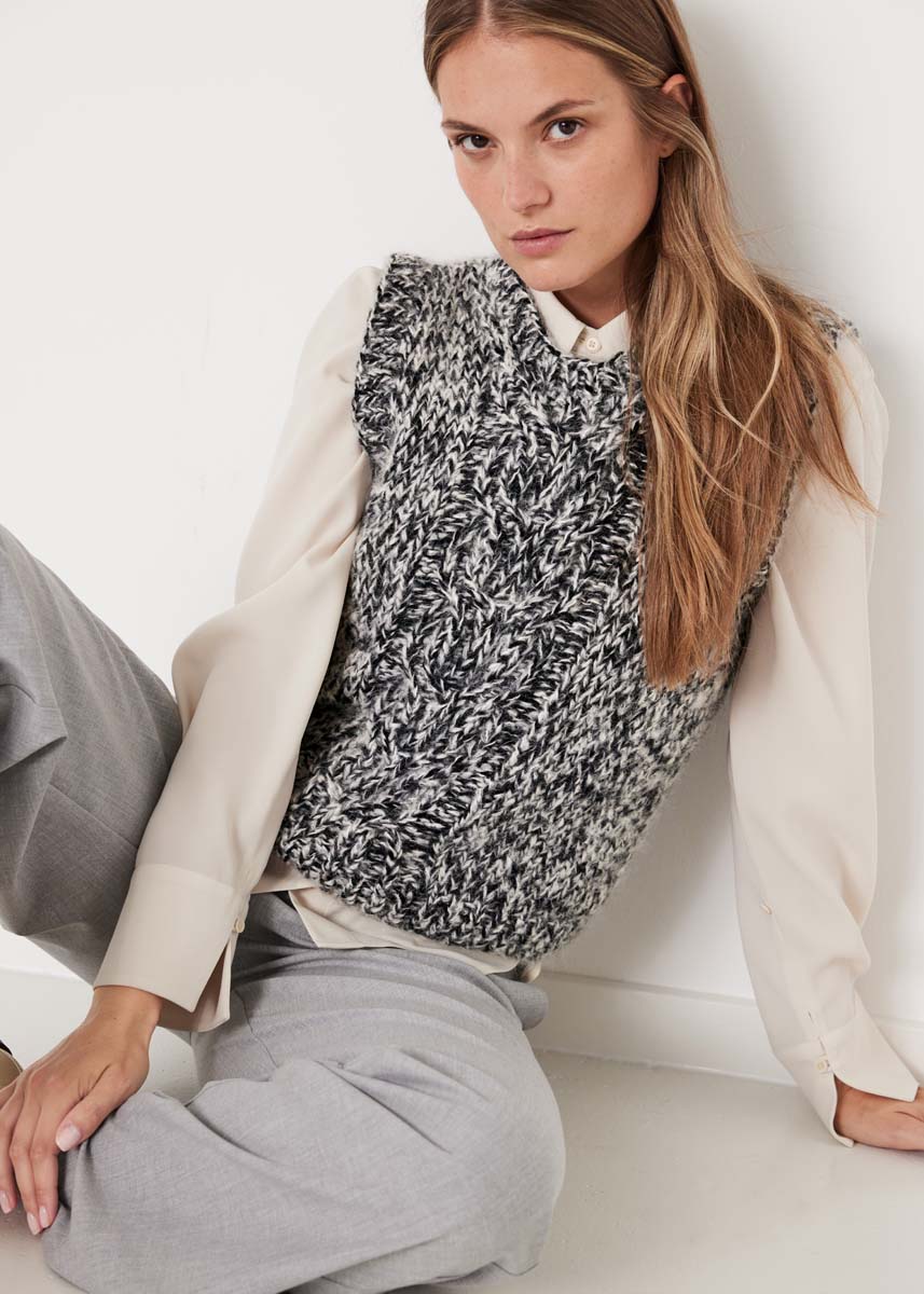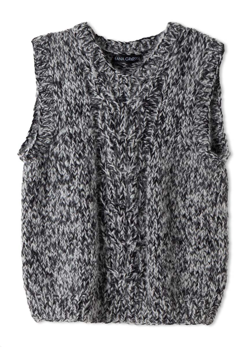 Lana Grossa Mohair Moda (70 % Mohair, 20 % Virgin wool Merino, 10 % Polyamide; 140 m/50 g), 150 (150 - 200) g in raw white (col 18); needles size 6 and 8 mm; 1 circular needle size 6 mm, 40 cm long; 1 cable needle.