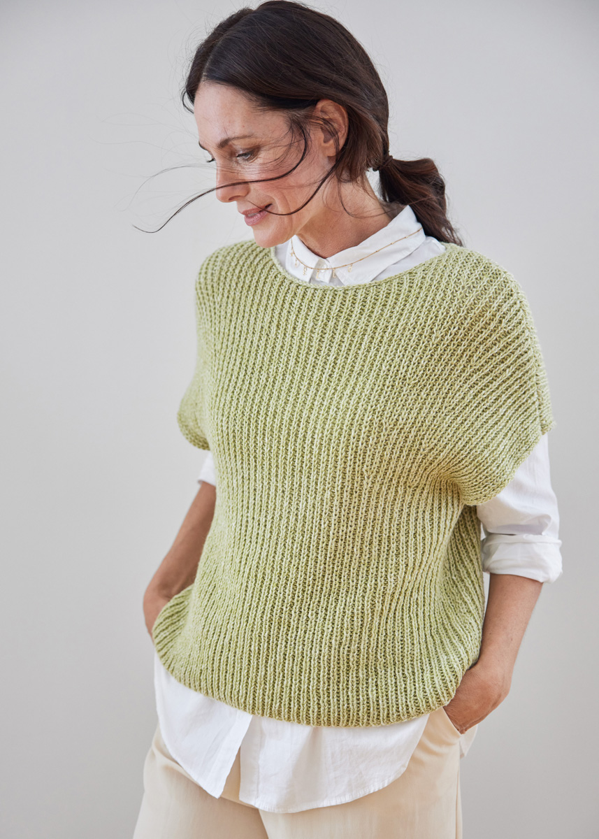 350 (400, 450) g of Lana Grossa Cara (57% baby alpaca, 33% cotton, 10% Merino wool) in Lime (col 13). Size 4.5 mm needles; size 4 mm circular needle, 40 cm long