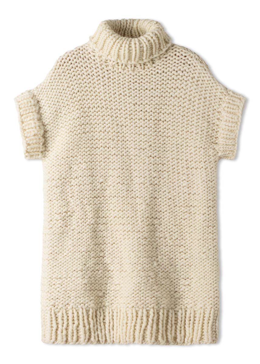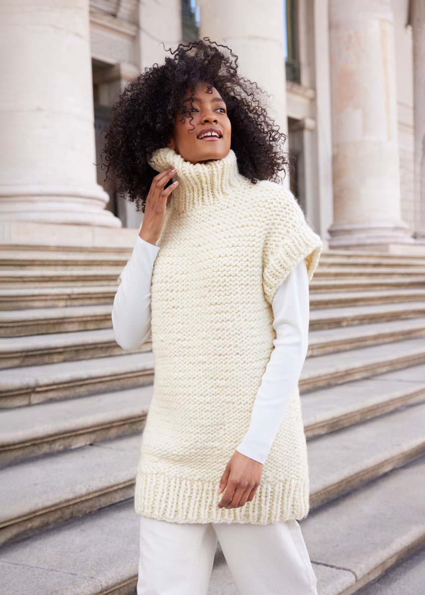 1000 (1100, 1200) g of Lana Grossa Confetti (100% Merino wool; 50 m/100 g) in Off White (col 109). Size 12 and 15 mm needles; one set size 12 mm double-pointed needles [dpns].