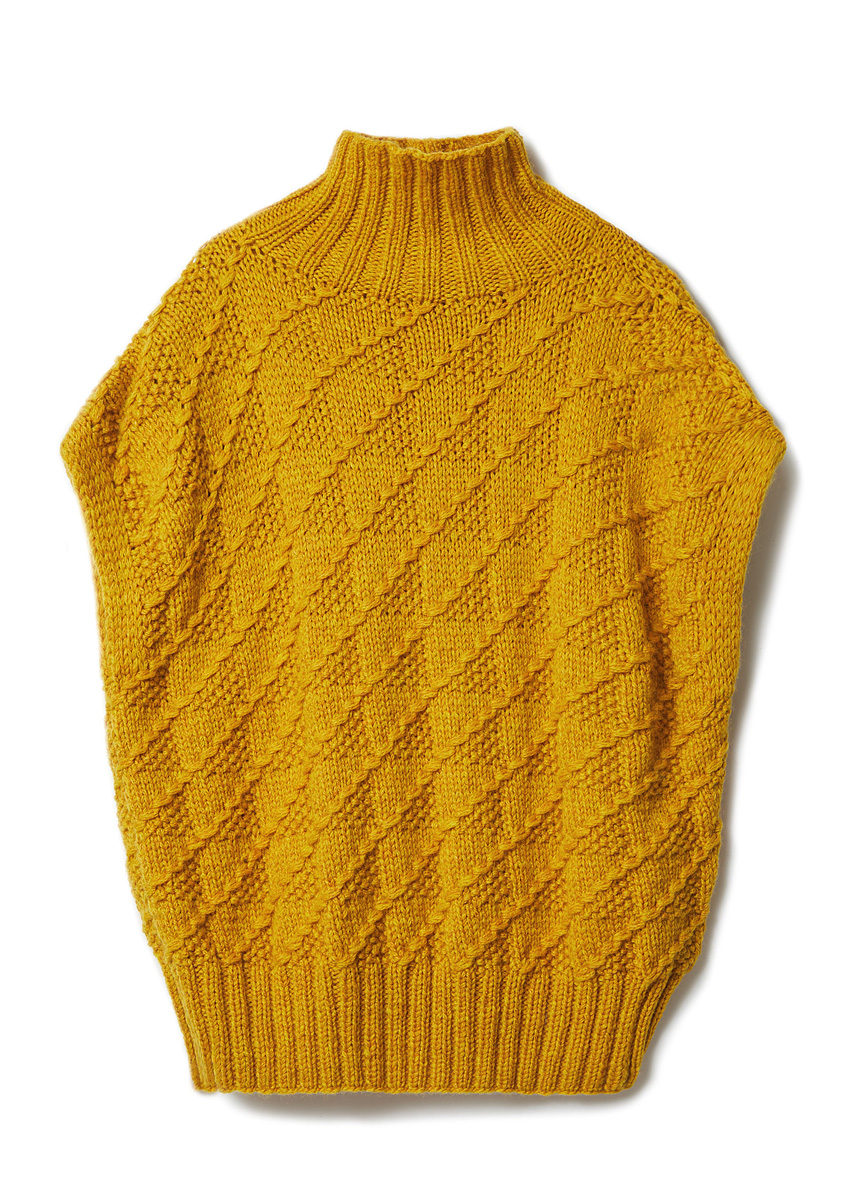 500 (550, 600, 650) g of Lana Grossa Cool Merino Big (90% Merino wool, 10% polyamide; 90 m/50 g) in Golden Yellow (col 214). Size 5 and 7 mm needles; short size 5 mm circular needle.