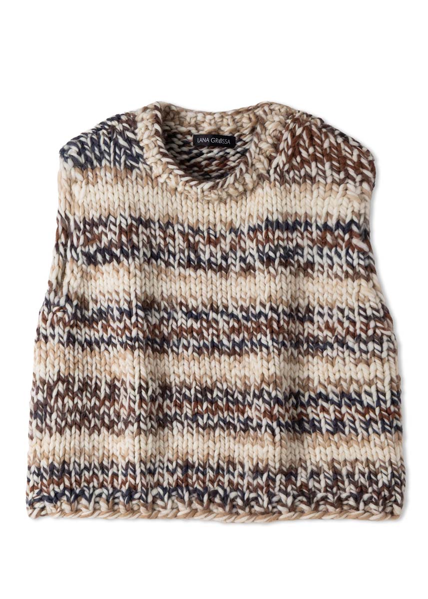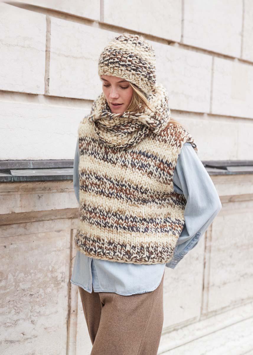 500 (600, 600) g of Lana Grossa Dolce (100% Merino wool (basolan); 50 m/100 g) in Off White/Beige/Nougat/ Grey (col 1). Size 12 mm needles; one set size 12 mm double-pointed needles [dpns]; stitch holder.
