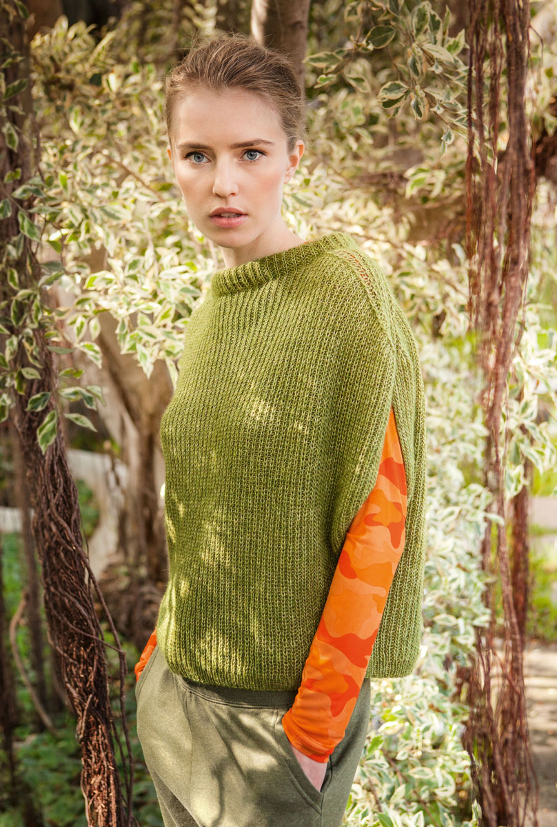 300 (350, 400) g of Lana Grossa Ecopuno (72% cotton, 17% Merino wool, 11% baby alpaca; 215 m/50 g) in Apple (col 2). Size 4 mm needles; size 4 mm circular needle, 40 cm long