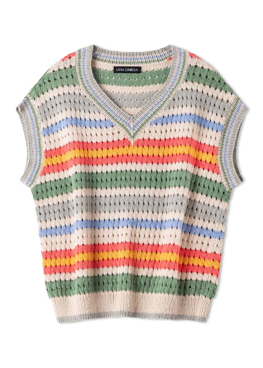 Lana Grossa "Ecopuno" (72% cotton, 17% virgin wool (merino), 11% alpaca (baby), running length 215 m/50 g), 100 (150 - 150) g in pearl beige (col. 66), 50 (100 - 100) g in reseda green (col. 20), 50 (50 - 100) g in gray beige (col. 93), 50 g each in lobster (col. 90), light blue (col. 13), and saffron yellow (col. 216); size 3 and 4 knitting needles, 1 each of size 3 circular needles, 40 and 60 cm long