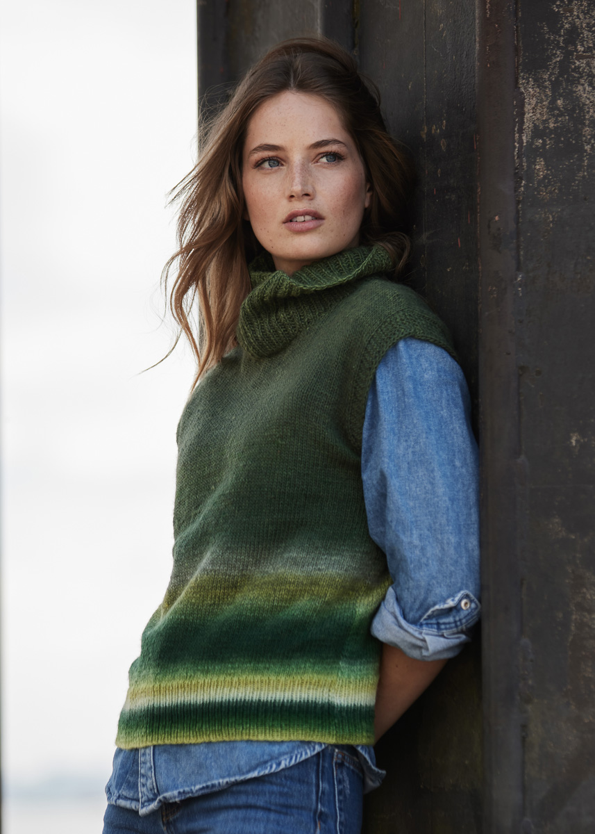 400 (400, 400) g of Lana Grossa Gomitolo Finito (100% Merino wool; 520 m/200 g) in Moss Green/Black Green/Olive/Grey Green/Pistachio (col 564). Size 3.5 and 4 mm needles; short size 3.5 mm circular needle