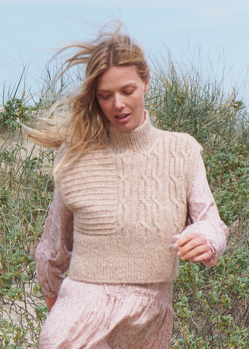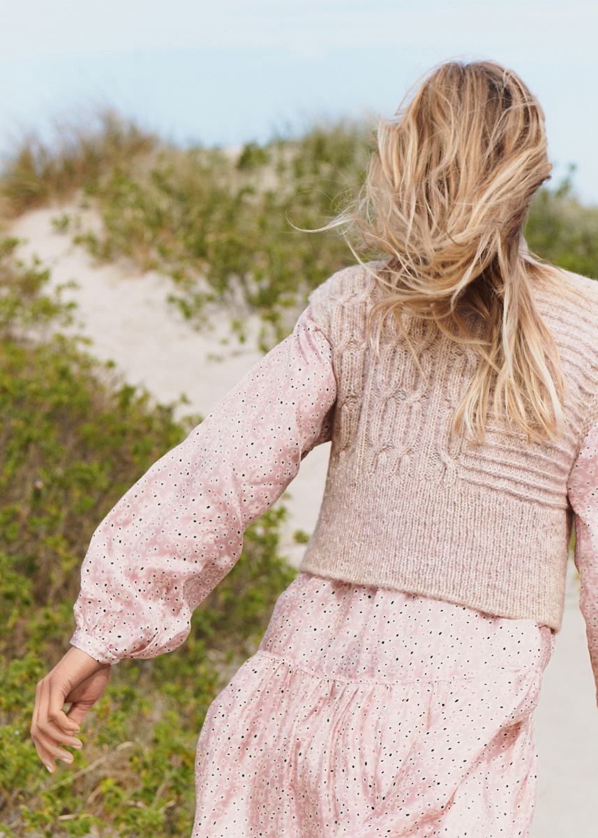 250 (300, 350, 400) g of Lana Grossa Natural Alpaca Pelo (63% cotton, 31% baby alpaca, 6% Merino wool; 125 m/50 g) in Light Beige (col 06). Size 5 mm circular needle, 80 – 100 cm long; size 4 mm circular needles, 40 and 80 cm long; cable needle [cn]; stitch markers