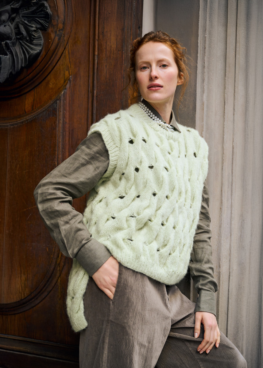 350 (400, 450) g of Lana Grossa Nebbia (55% extrafine Merino wool, 45% baby alpaca; 170 m/50 g) in White Green (col 9). Size 4.5 and 6 mm needles; short size 4.5 mm circular needle; cable needle [cn].