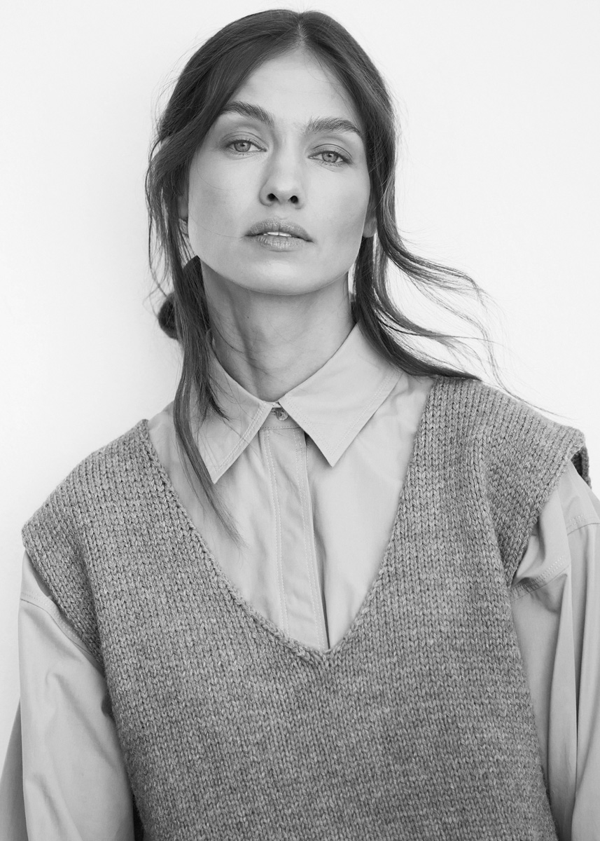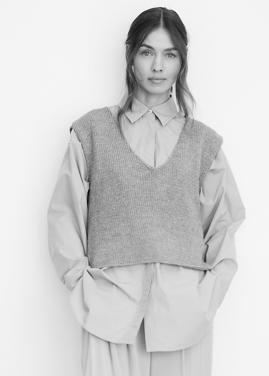 300 (350, 350, 400) g of Lana Grossa New Classic (48% Merino wool, 36% viscose, [bamboo], 8% yak, 8% nylon; 100 m/50 g) in Sand (col 7). Size 5.5 mm needles