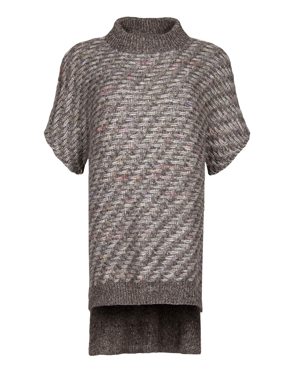 200 (250, 300) g of Lana Grossa Smokey (46 % pure wool, 41 % cotton, 8 % polyamide, 5 % yak; 225 m 50 g) in Greige / Beige / Dark Grey (col 207) and 150 (200, 250) g of Lana Grossa Lala Berlin Lovely Fine Tweed (37 % alpaca, 35 % polyamide, 26 % pure wool, 2 % viscose; 175 m / 50 g) in Light Grey (col 105). Size 3.5 and 7 mm needles; size 3.5 mm circular needle, 40 cm long