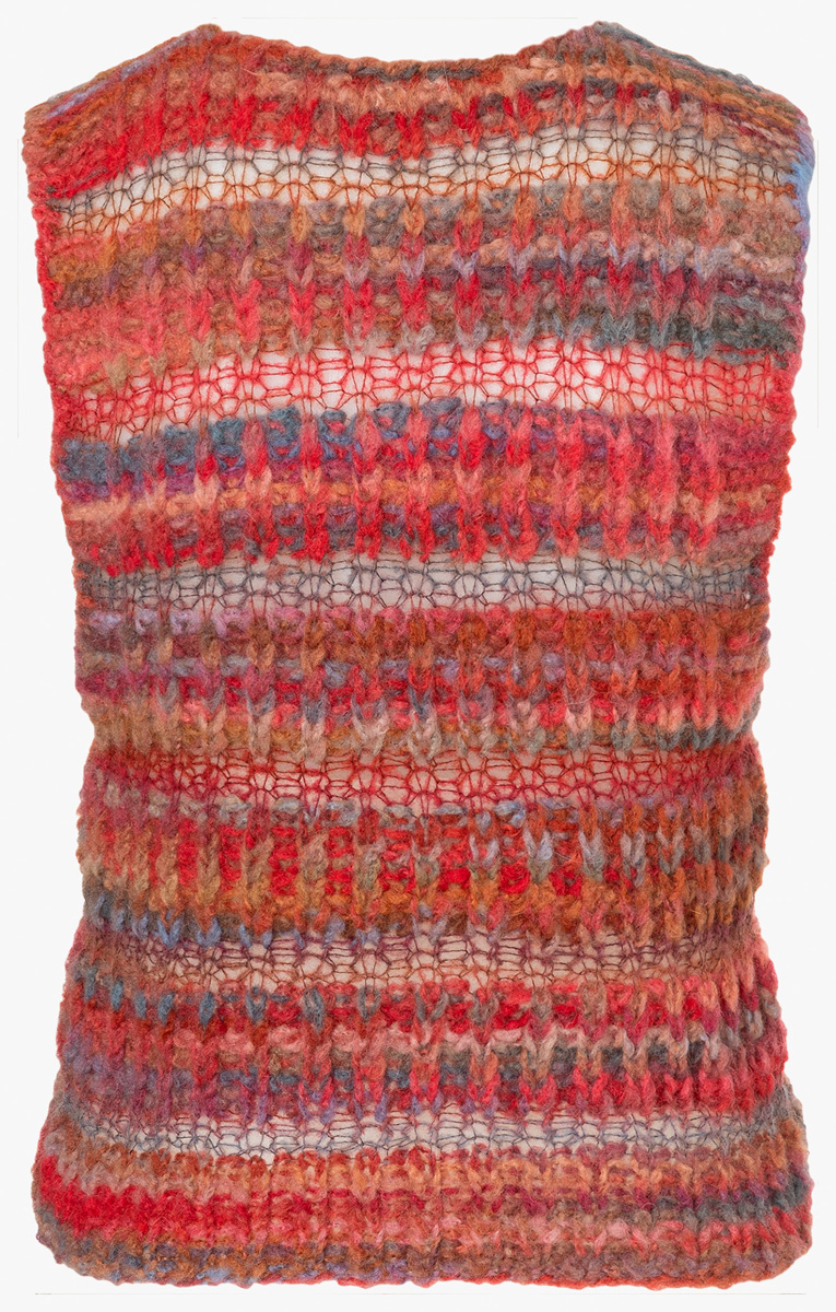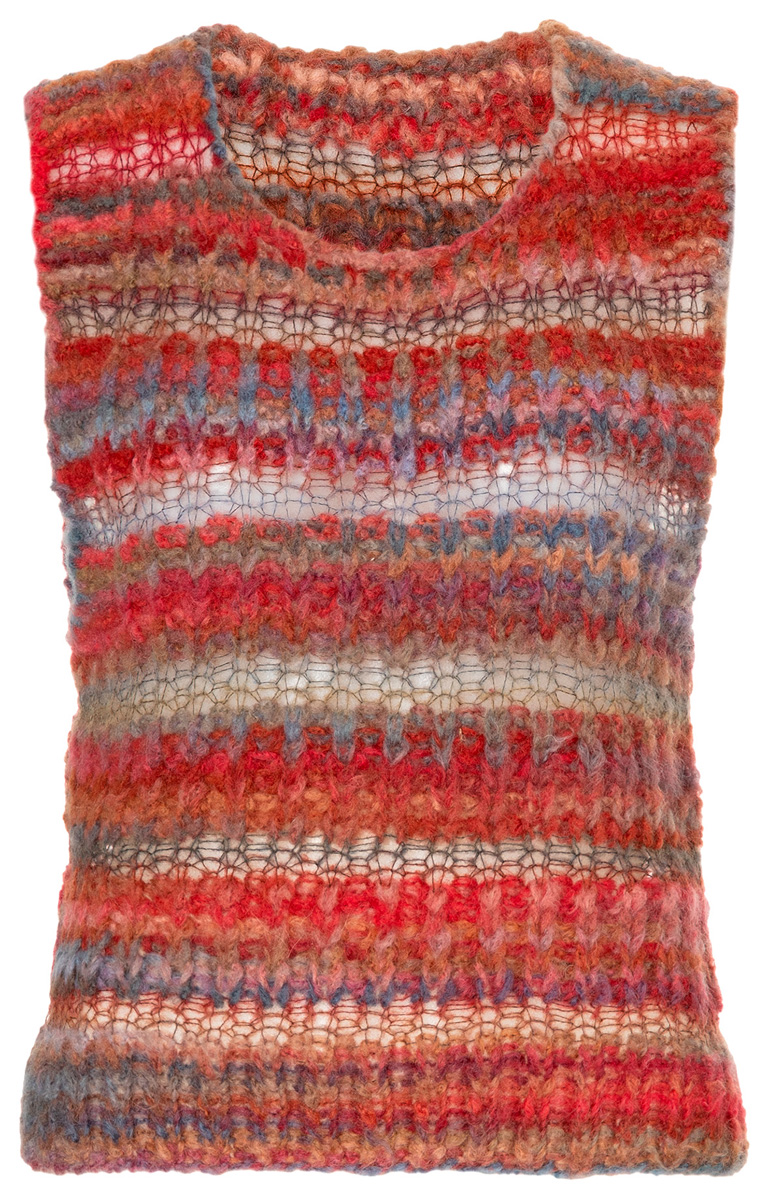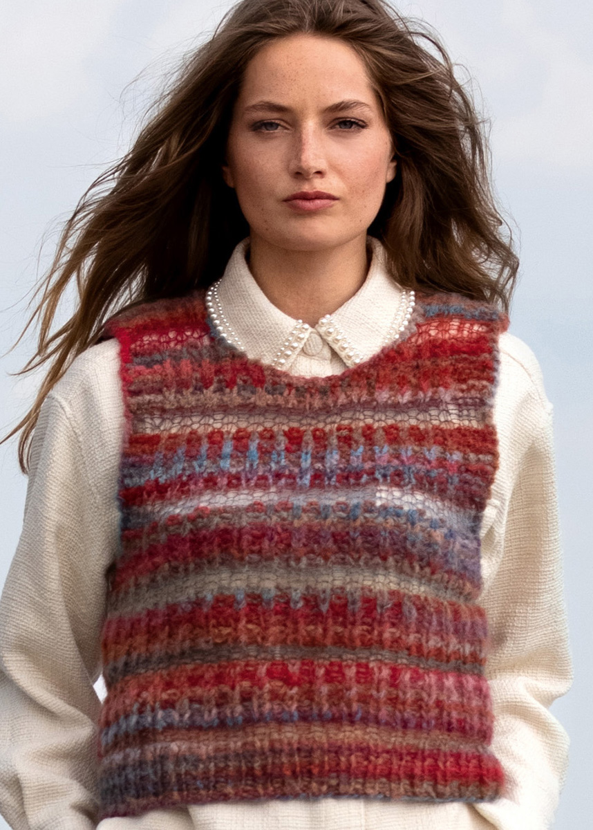 100 (100, 150) g of Lana Grossa Twin 50g (46% baby alpaca, 45% Merino wool, 9% polyamide; 85 m/50 g) in Red/Wine/Pink/Blue Grey/Petrol (col 207) and 25 (50, 50) g of Lana Grossa Twin 25g (37% baby alpaca, 37% Merino wool, 26% polyamide; 200 m/25 g) in Red/Pink/Light Blue/ Grey Blue/Rust/Camel (col 107). Size 8 mm needles; size 4.5 mm crochet hook
