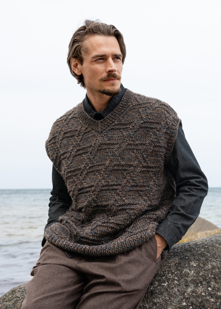 550 (650) g of Lana Grossa Vintage Chunky (100% Merino wool; 80 m/50 g) in Grey Brown/Dark Grey (col 12). Size 4.5 and 5.5 mm needles; size 4.5 mm circular needle, 40 cm long.