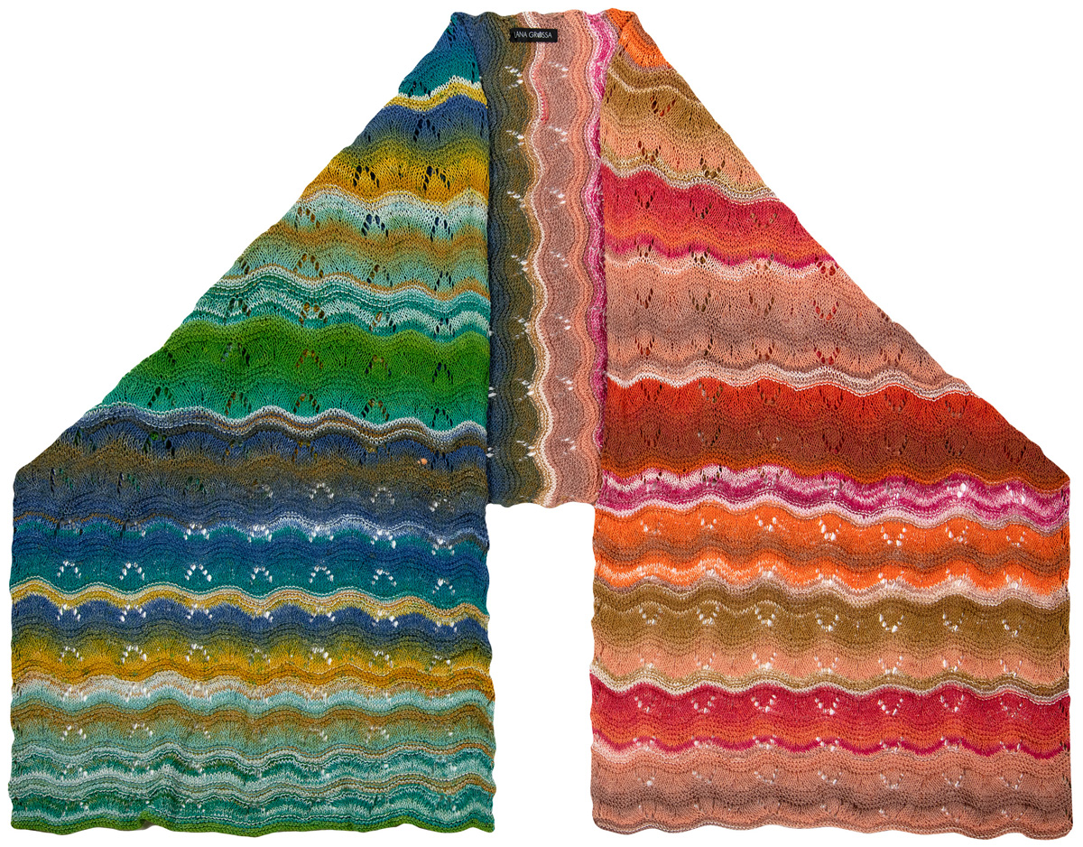 400 g each of Lana Grossa Gomitolo Denim Inca (80% cotton, 20% polyamide; 740 m/200 g) in Khaki/ Turquoise/Emerald/Light Blue/Yellow-Green/Jade/Ink/Petrol/ Mustuard (col 151) and Pink/Orange/Pink/Antique Pink/Pale Pink/Camel/Ochre (col 155). Size 4 mm needles