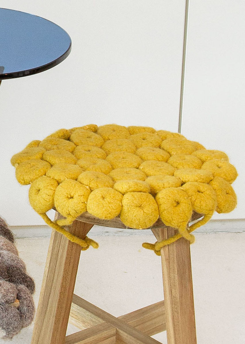 450 g each of Lana Grossa Lei (100% Merino wool; 40 m/50 g) in Dark Olive (col 86) and Safran (col 67). Size 10 mm crochet hook; matching sewing thread; sewing needle; 2 stools [SKOGSTA by IKEA].