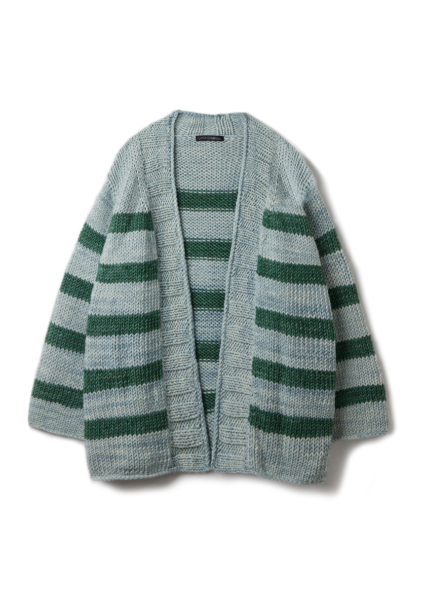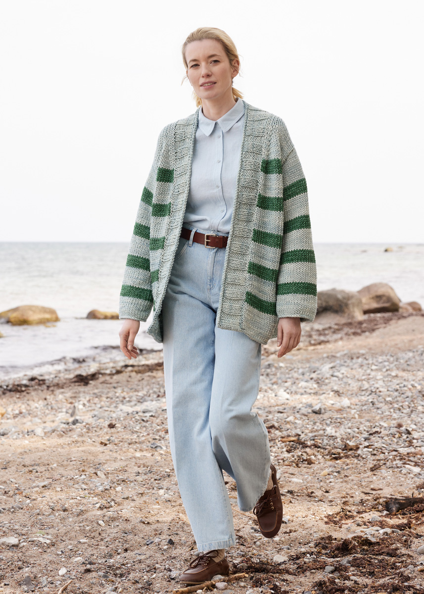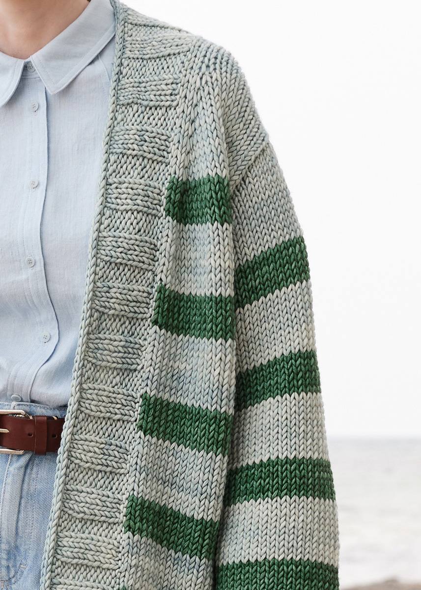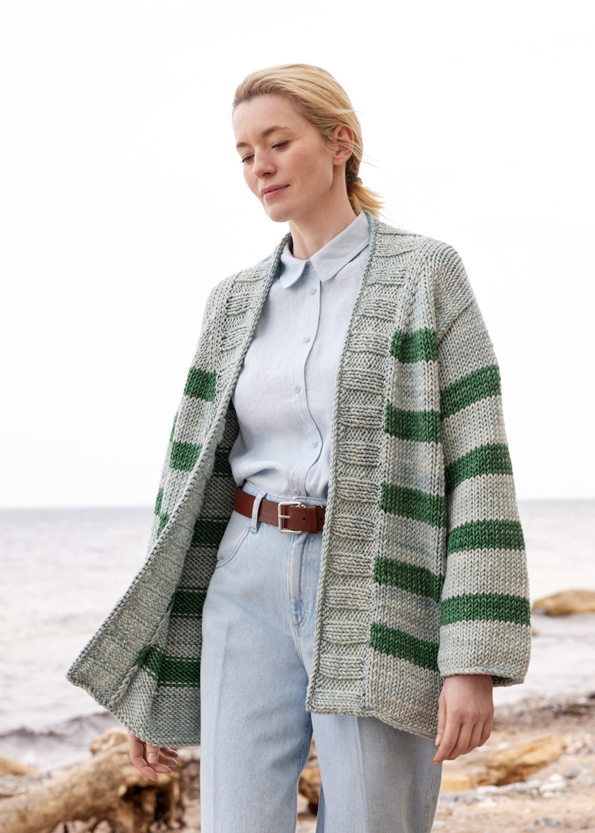 800 (900, 900) g of Lana Grossa Vintage Superchunky (100% Merino wool; 80 m/100 g) in White Green (col 517) and 300 g in Opal (col 518). Size 8 mm circular needles, 40, 80 and 100 – 120 cm long; size 6.5 mm circular needle, 120 cm long; size 5.5 mm crochet hook; stitch markers, stitch holders.