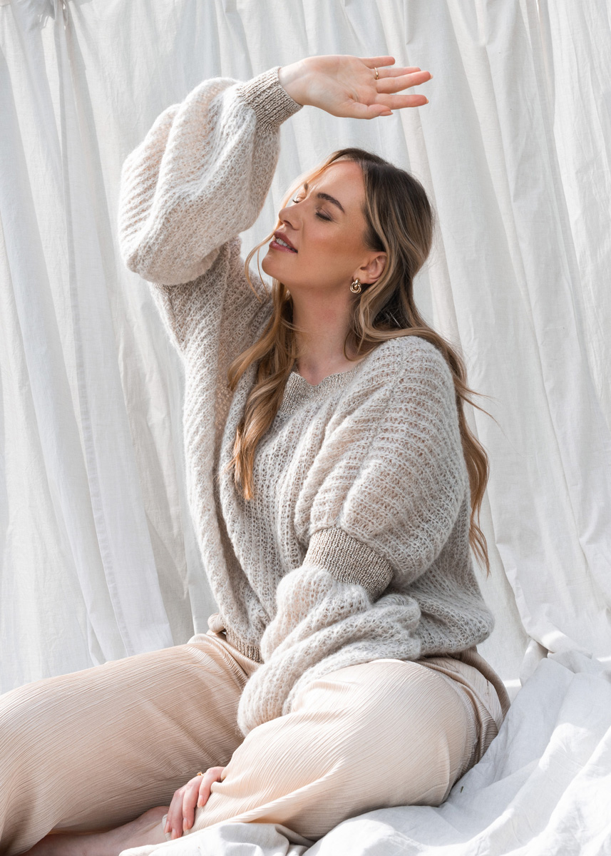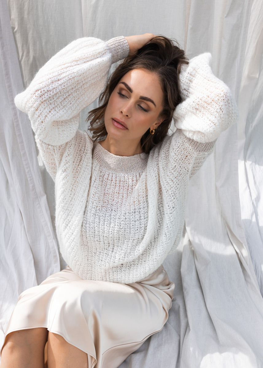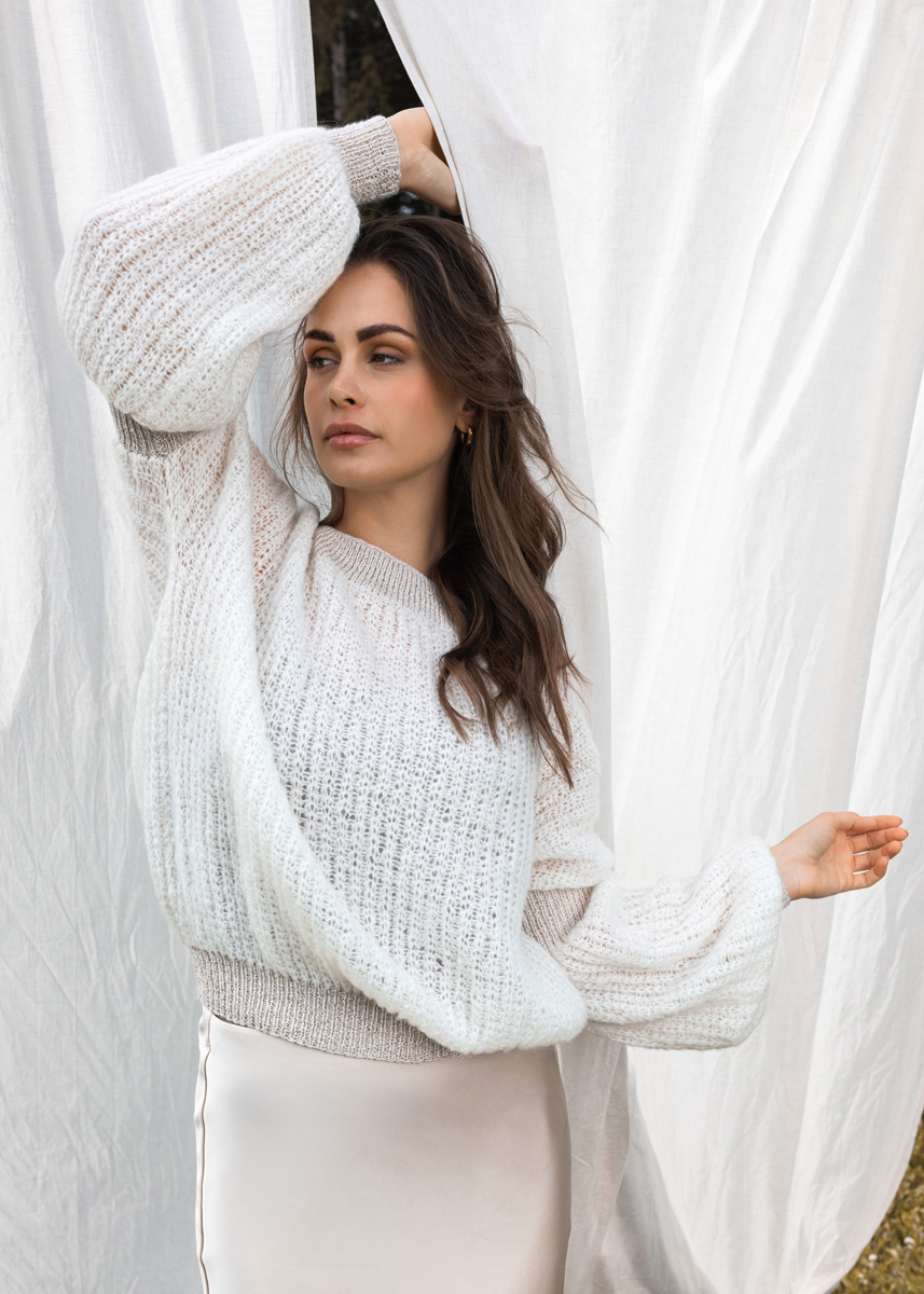 • 50 g off white (col 14) or taupe (col 32) Lana Grossa BRILLINO 83 % Viscose, 17 % Lurex Length: approx. 200 m / 25 g