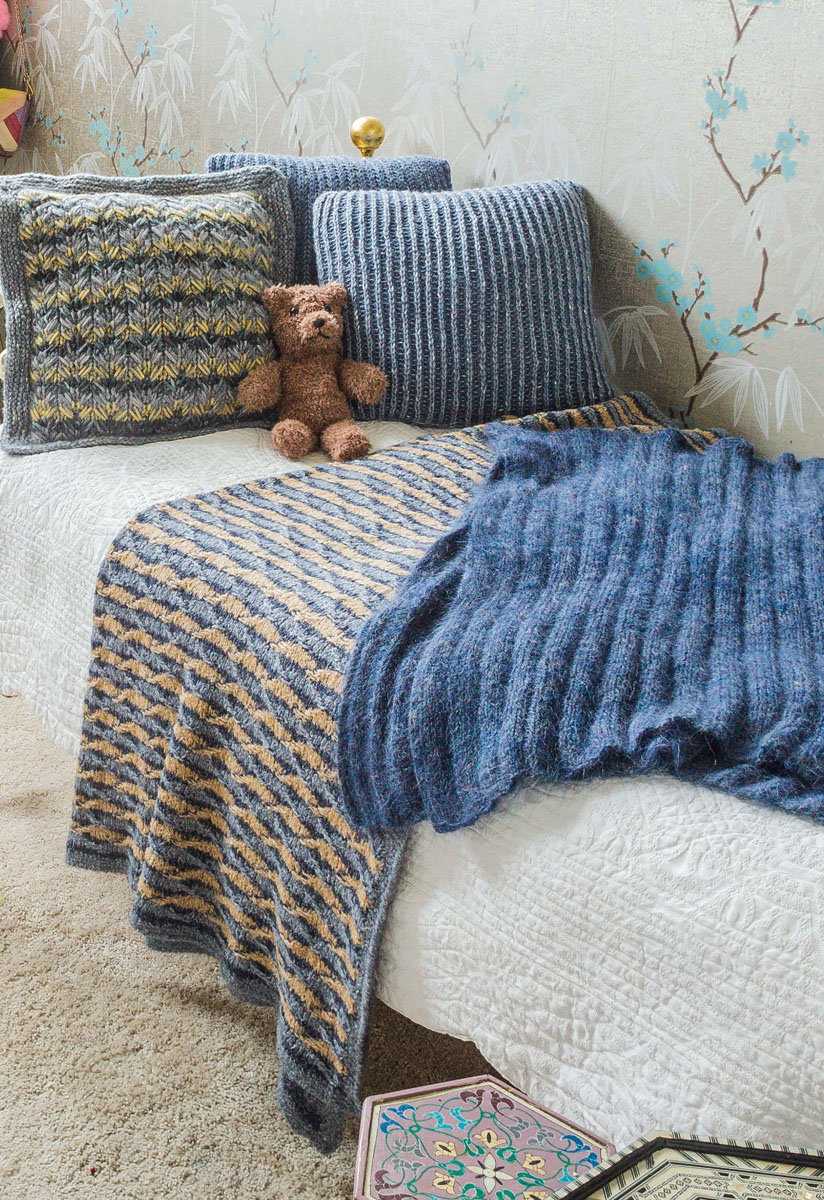 200 g each of Lana Grossa Anima (15 % baby alpaca, 34% cotton, 15% polyamide; 160 m/50 g) in Grey-Blue Melange (col 4), Dark Blue Melange (col 8) and Camel Melange (col 13). Size 5 mm circular needle, 100 cm long; size 4 mm crochet hook