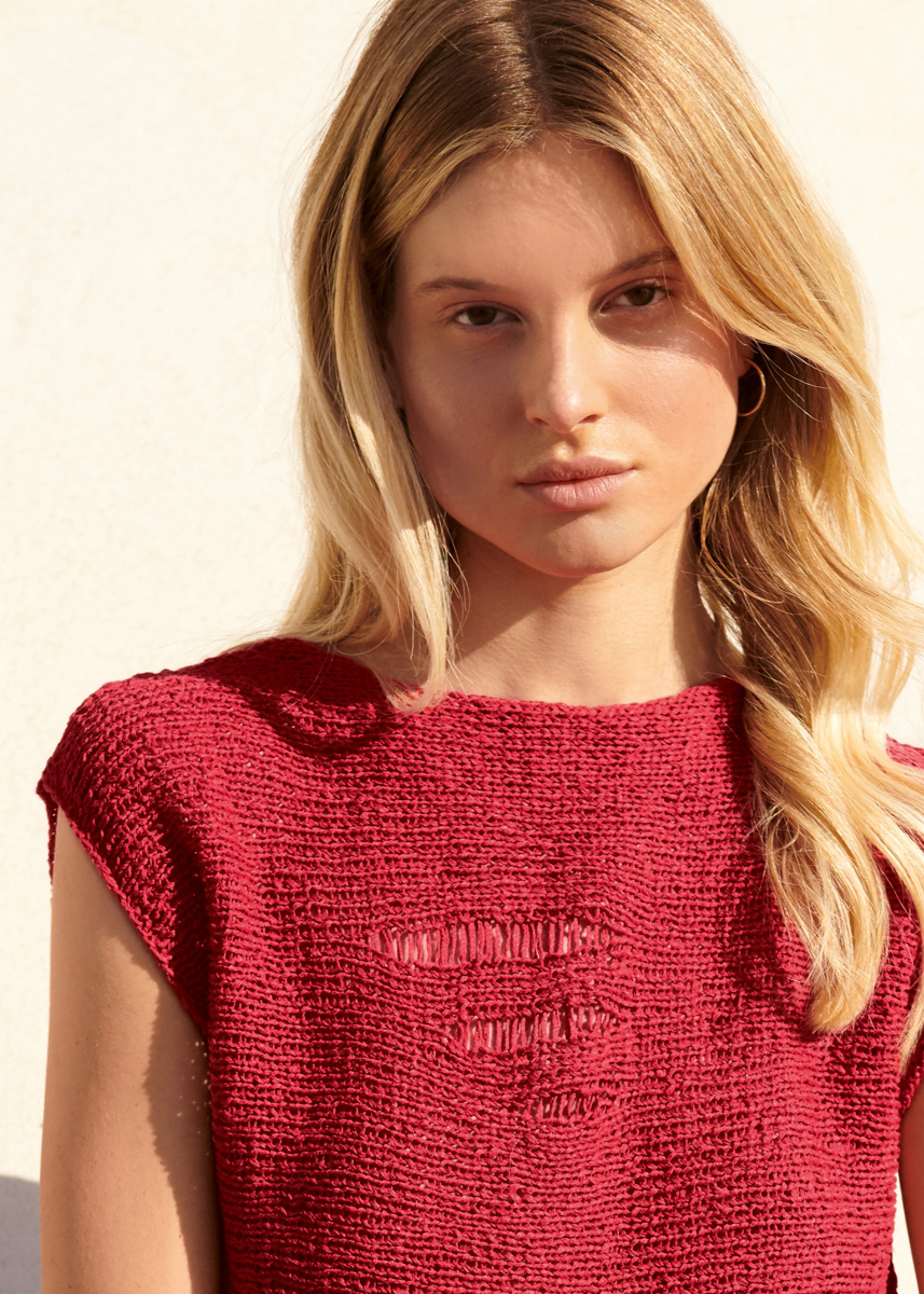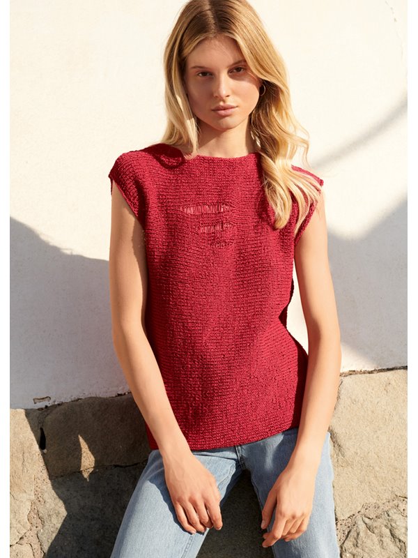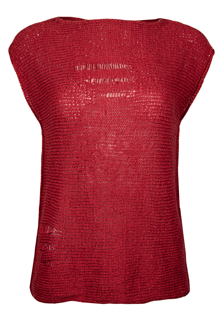350 (400, 450) g of Lana Grossa About Berlin Chilly (100% linen; 95 m/50 g) in Red (col 6). Size 5 mm circular needle, 80 cm long; size 4 mm crochet hook
