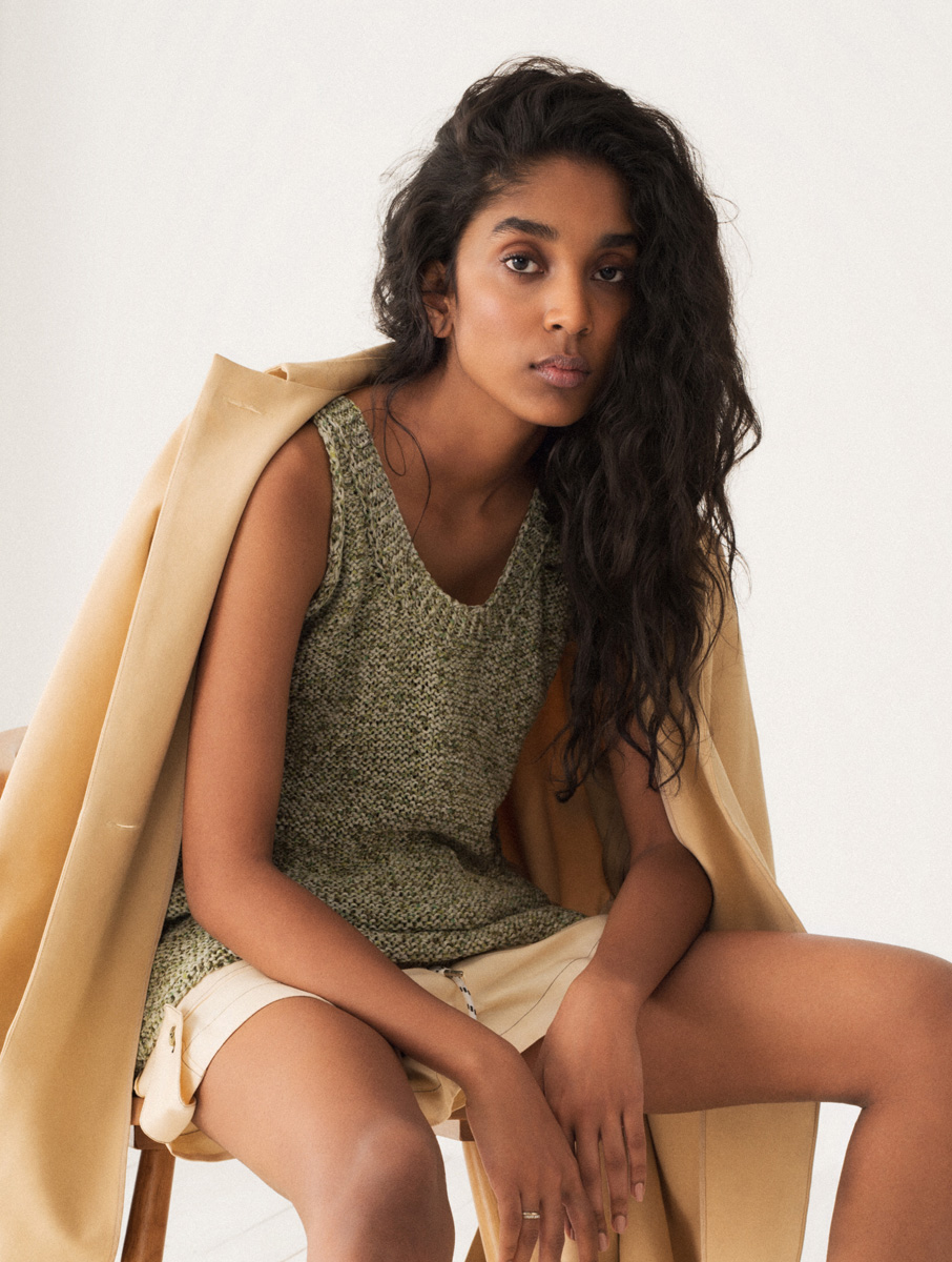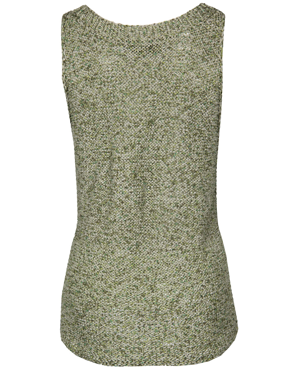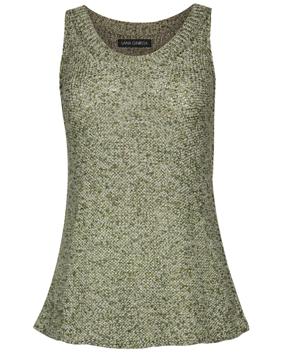 250 (300, 350) g of Lana Grossa About Berlin Sparkly (82% cotton, 18% polyester; 120 m/50 g) in Linen/ Khaki/Dark Green/Olive (col 11). Size 8 mm needles; size 5 mm circular needle, 40 cm long
