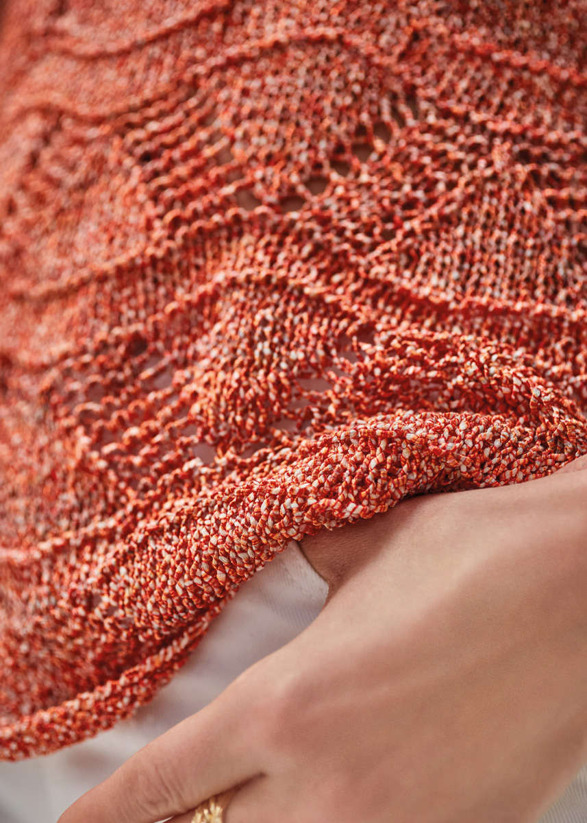 250 (300, 350) g of Lana Grossa Alessia (76% cotton, 20% recycled polyester, 4% polyester; 135 m/50 g) in Gold/Copper/Grey Green/Mint (col 102) or Red/Orange/Ecru (col 11). Size 5 mm needles; size 4 mm circular needle, 40 cm long.