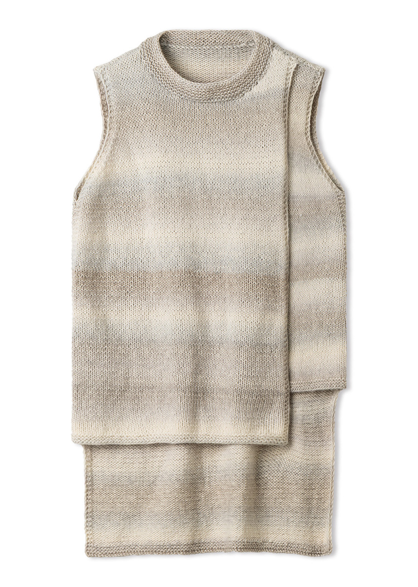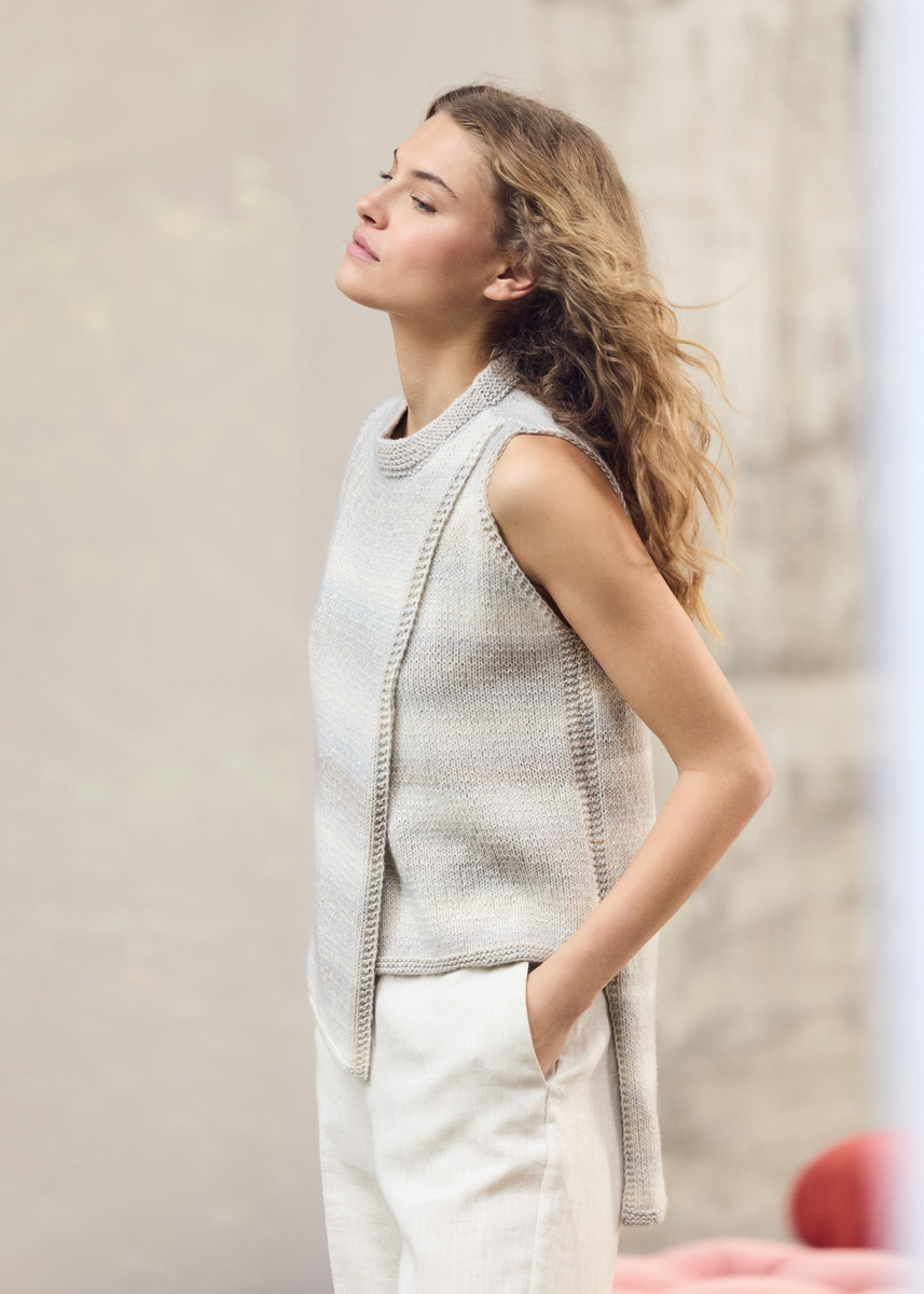 400 (500, 500, 600) g of Lana Grossa Corallo (70% organic cotton, 30% Merino wool; 210 m/100 g) in Beige/Greige/Off White (col 10). Size 4 and 4.5 mm needles; short size 4 mm circular needle.