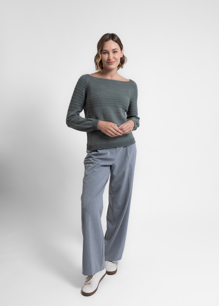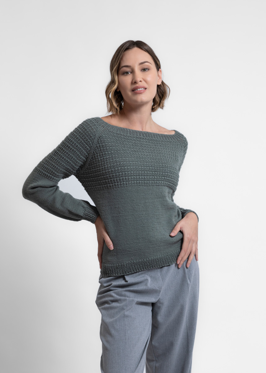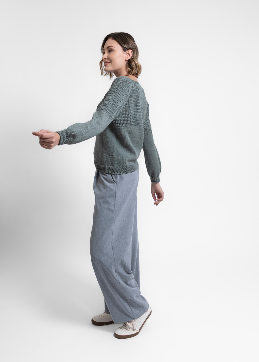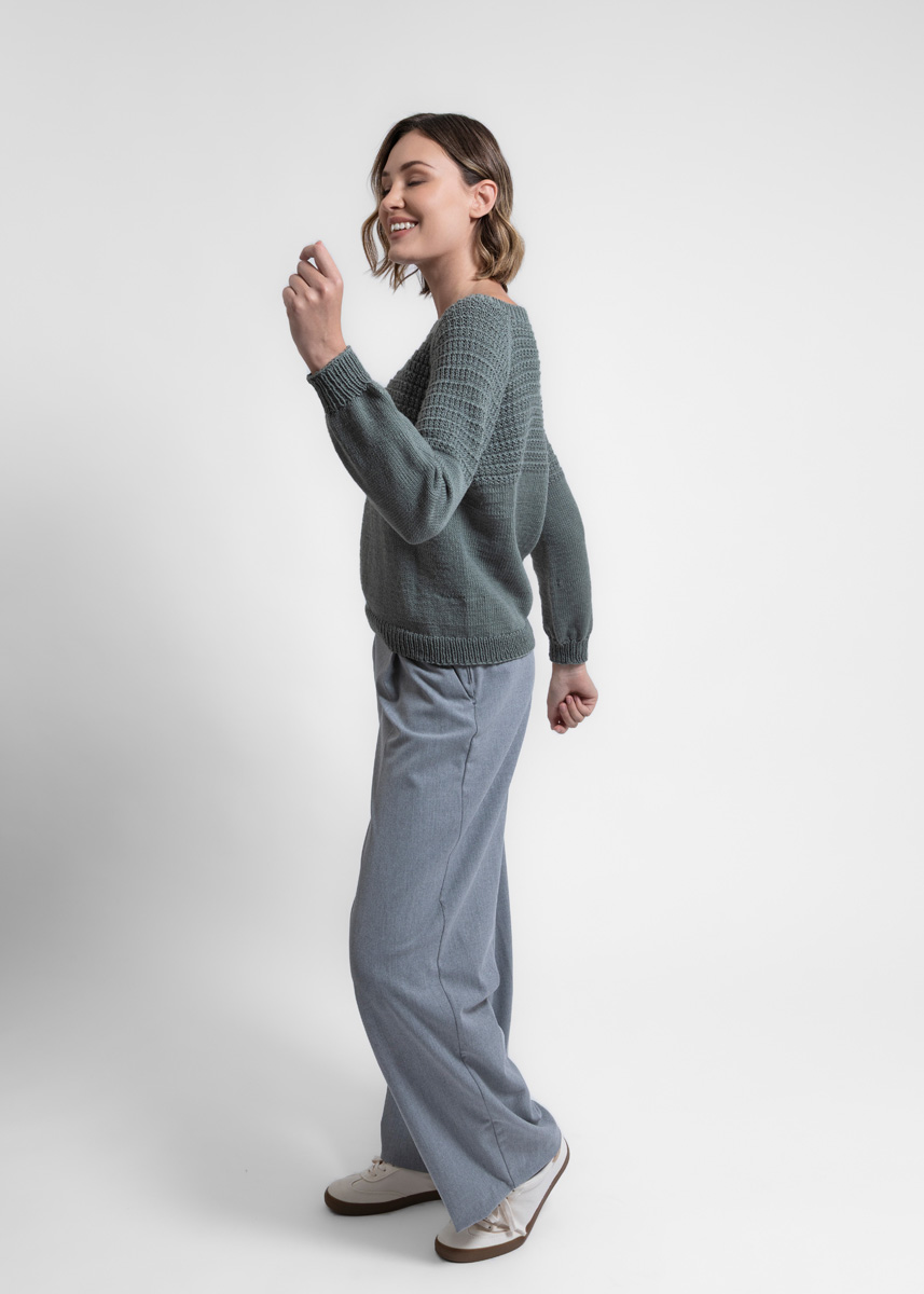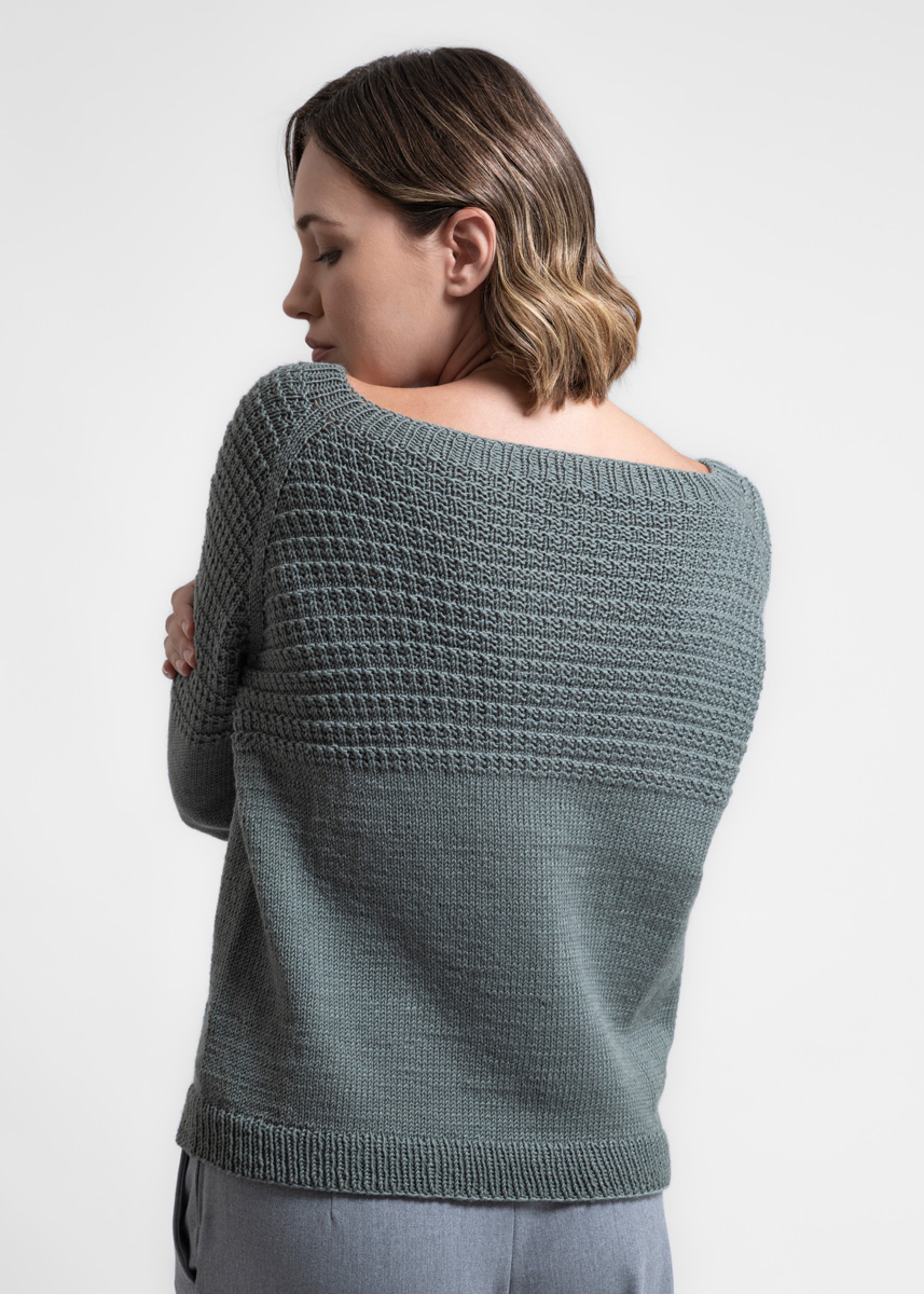 The pullover is knitted seamlessly from the top down and has a total length of 54 (56 - 58 - 60 - 62 - 64) cm and a positive ease of 10 cm at 80 (88 - 96 - 104 - 116 - 128) cm bust circumference.