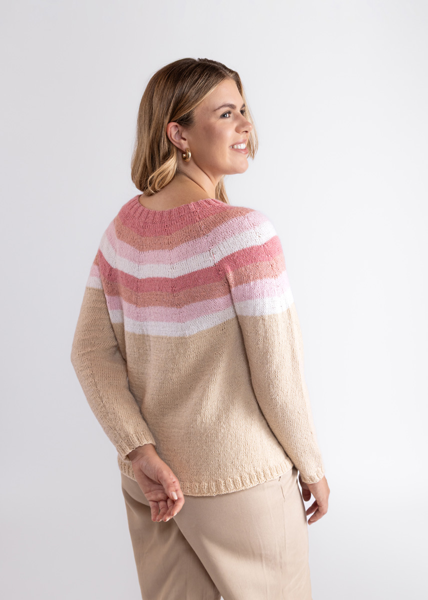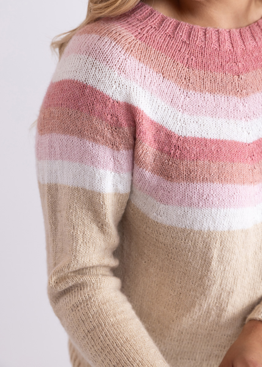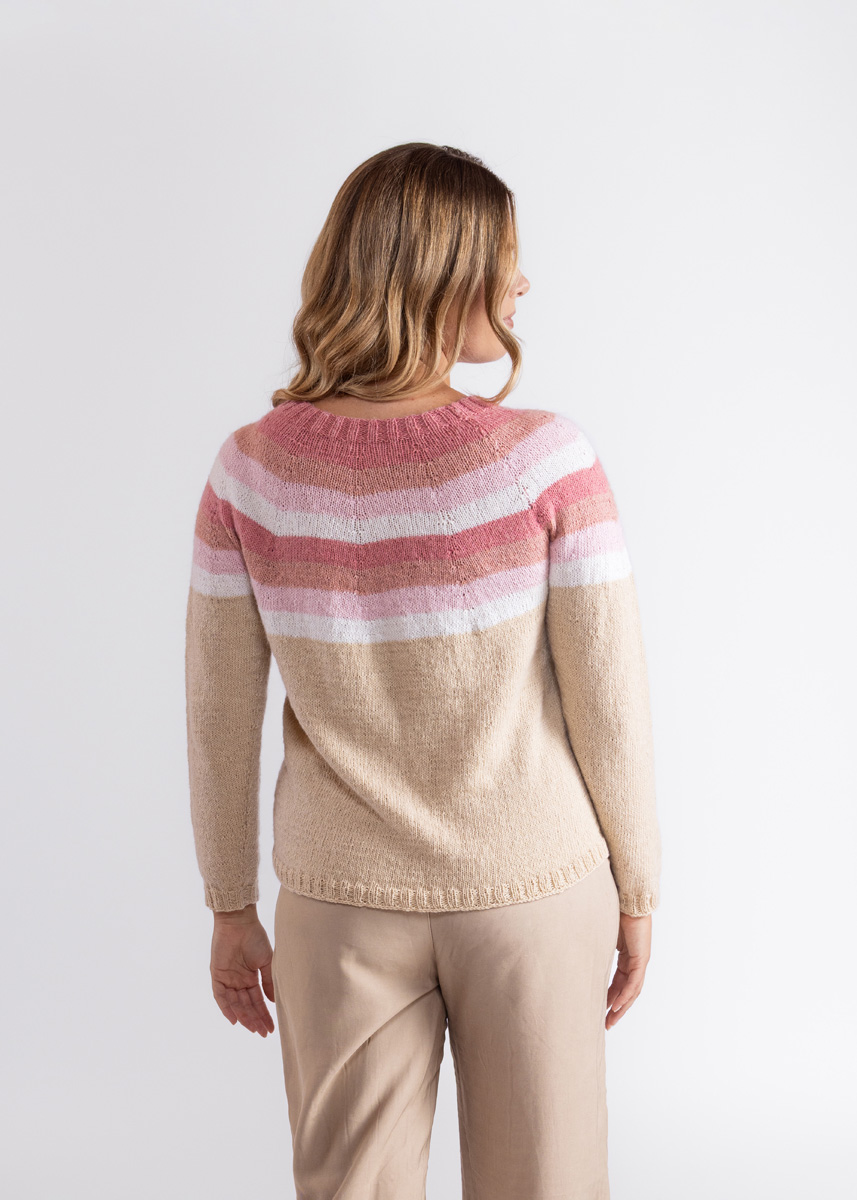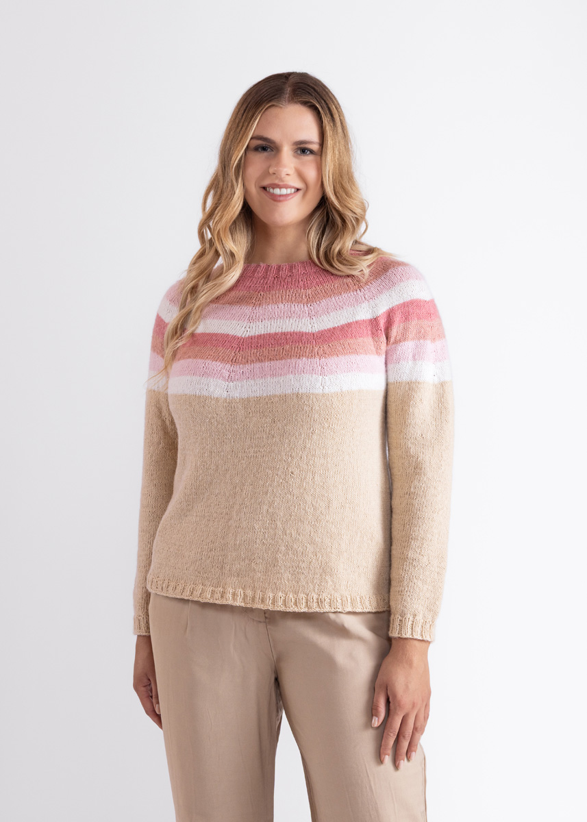 The pullover is knitted seamlessly from the top down and has a total length of 55 (57 - 59 - 61 - 63 - 65) cm and a positive ease of 14 cm at 80 cm bust circumference (14 cm at 88 cm bust circumference - 14 cm at 96 cm bust circumference - 12 cm at 104 cm bust circumference - 14 cm at 116 cm bust circumference - 14 cm at 128 cm bust circumference).