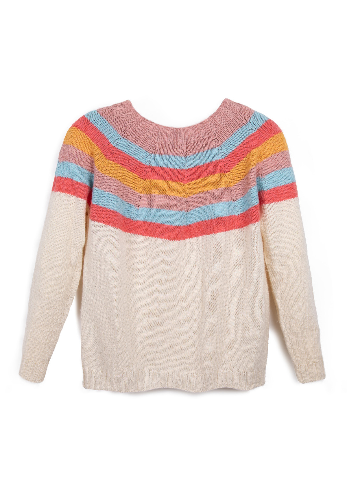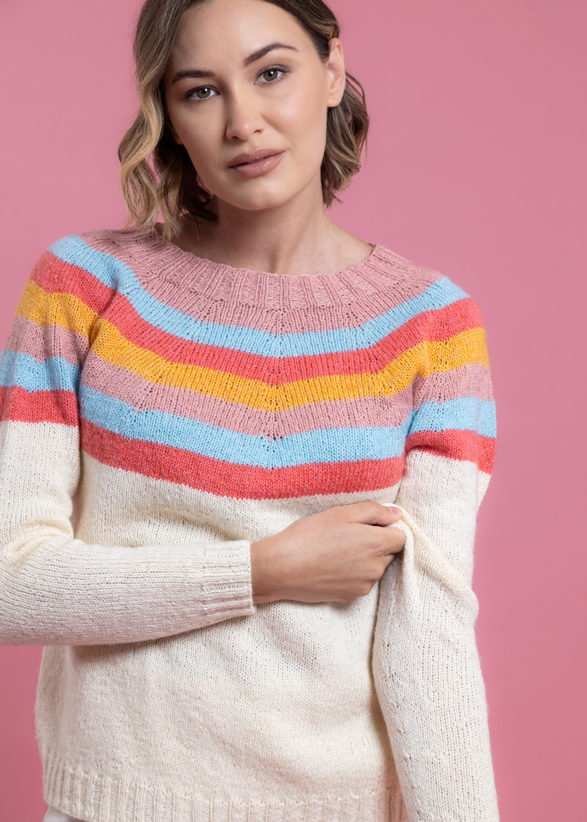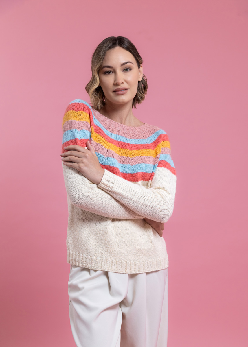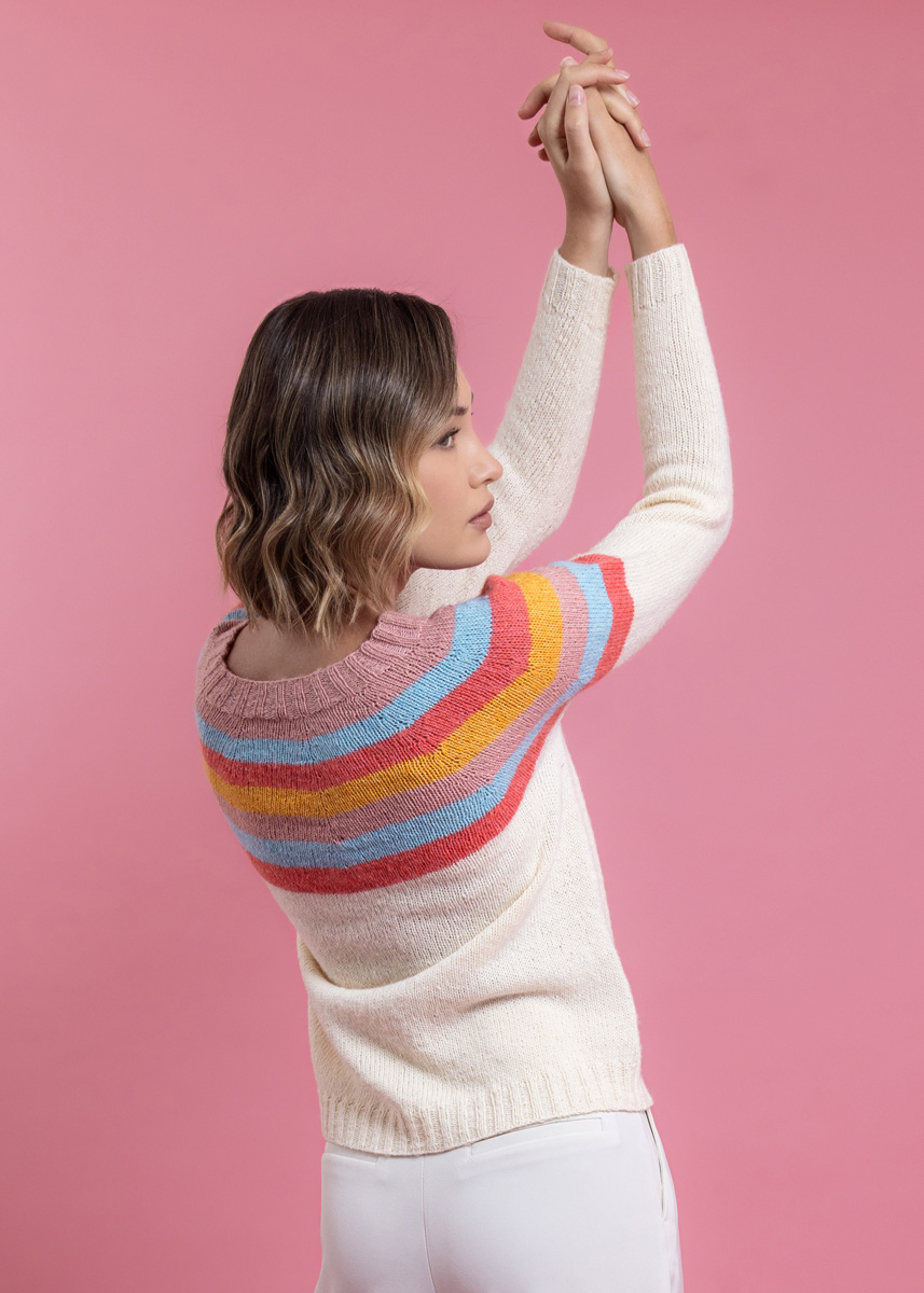 The pullover is knitted seamlessly from the top down and has a total length of 55 (57 - 59 - 61 - 63 - 65) cm and a positive ease of 14 cm at 80 cm bust circumference (14 cm at 88 cm bust circumference - 14 cm at 96 cm bust circumference - 12 cm at 104 cm bust circumference - 14 cm at 116 cm bust circumference - 14 cm at 128 cm bust circumference).