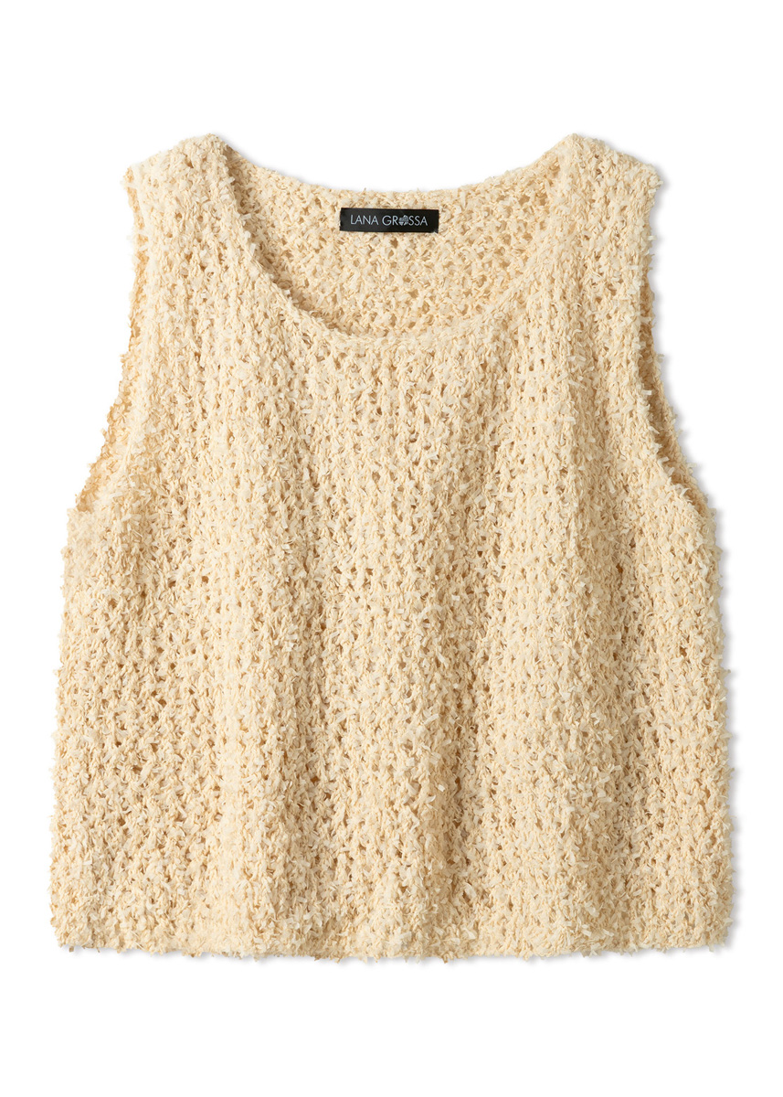 200 (200, 250, 250) g of Lana Grossa Frizzante (54% cotton, 46% polyamide; 105 m/50 g) in Cream (col 1). Size 5 mm needles; size 5 mm crochet hook.