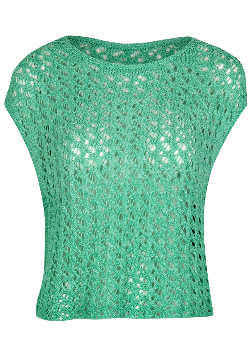 200 (200, 400) g of Lana Grossa Gomitolo Denim (80% cotton, 20% polyamide; 740 m/200 g) in Emerald (col 9). Size 4 mm needles; size 3.5 mm crochet hook