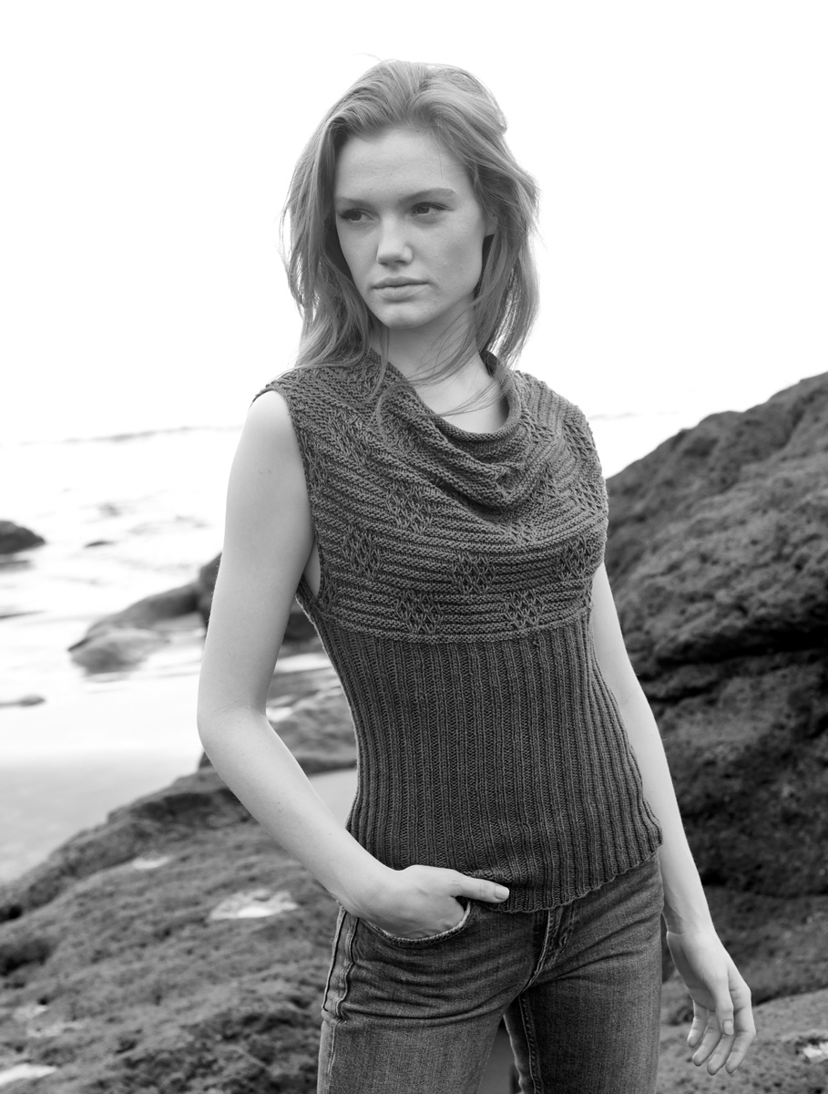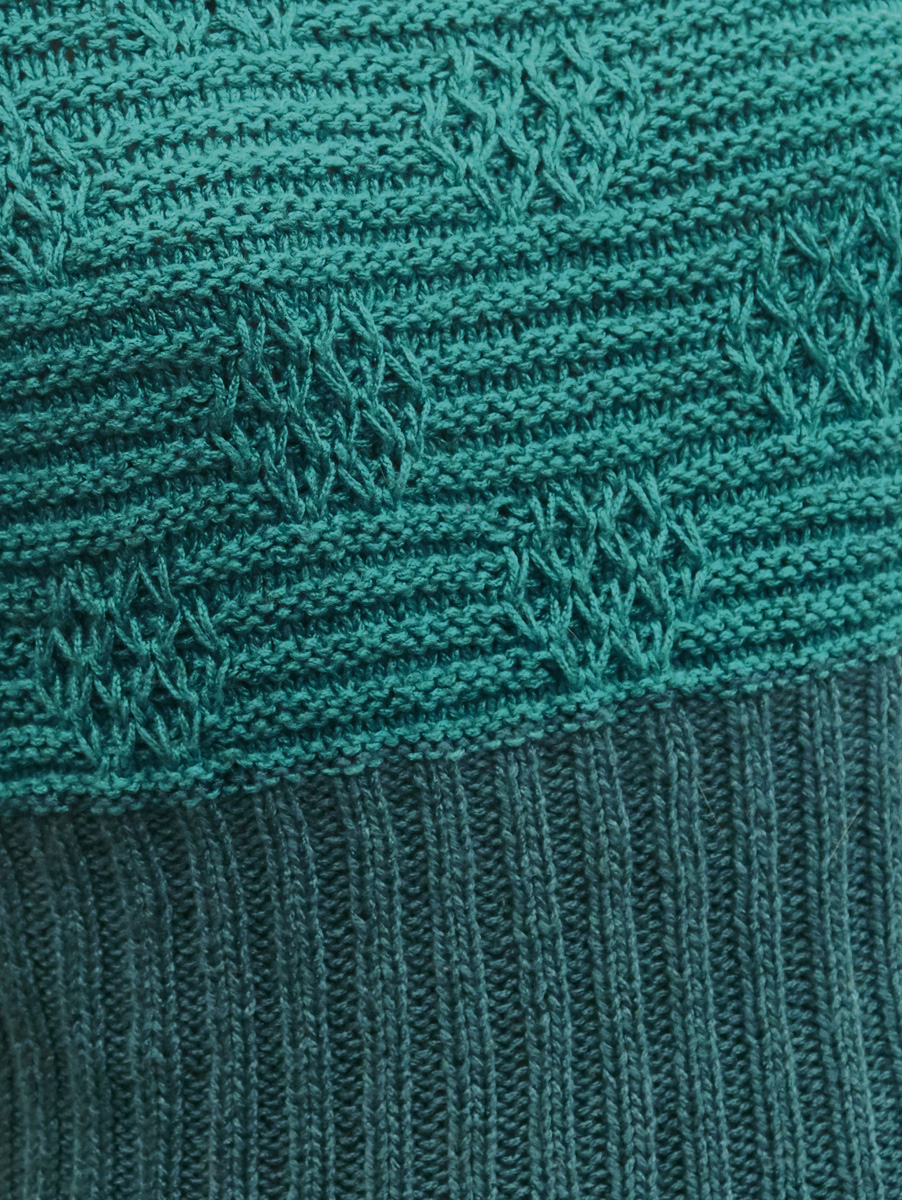 200 (250) g each of Lana Grossa Linarte (40% viscose, 30% cotton, 20% linen, 10% polyamide; 125 m/50 g) in Dark Petrol (col 73) and Petrol (col 13). Size 5 mm needles; size 4 mm circular needle, 60 cm long; cable needle [cn]; size 4.5 mm crochet hook