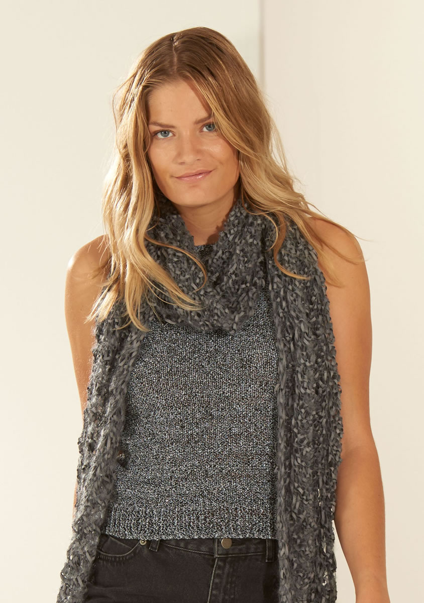 250 (300, 350) g of Lana Grossa Nizza (74% cotton, 25% polyester, 1% metallic fiber; 115 m/50 g) in Light Grey/Black/Silver (col 12). Size 4 and 5 mm needles; size 5 mm circular needle, 40 cm long; size 4 mm crochet hook; one 11 mm button