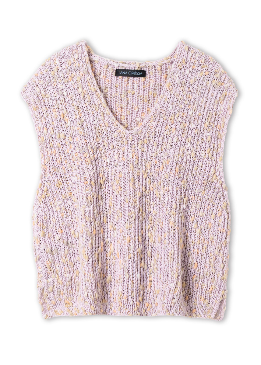 300 (350, 350, 400) g of Lana Grossa Popcorn (100% cotton; 125 m/50 g) in Pastel Pink/Pale Yellow/Light Grey/Peach (col 4). Size 4.5 and 5 mm needles; short size 4.5 mm circular needle.