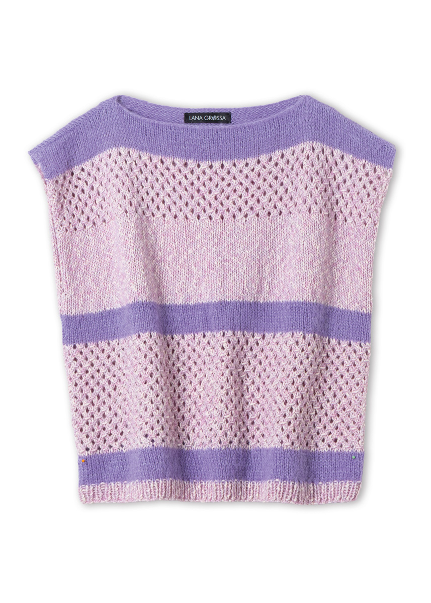 50 (50, 50, 75) g of Lana Grossa Setasuri (69% Suri alpaca, 31% silk; 212 m/25 g) in Violet (col 46); 200 (200, 250, 250) g of Lana Grossa Bottoni (53% cotton, 24% viscose, 23% extrafine Merino wool; 125 m/50 g) in Lilac/Off White (col 5). Size 4.5 mm needles.
