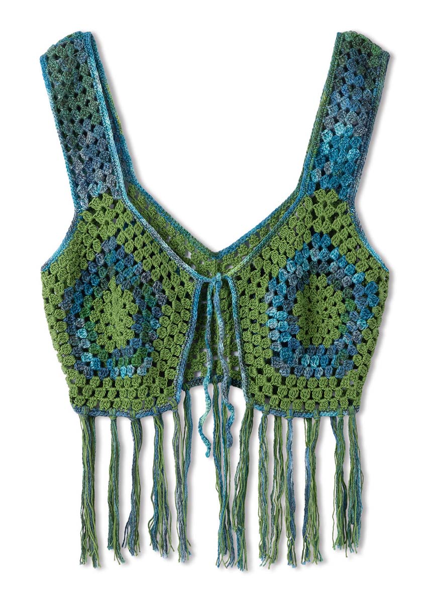 150 g of Lana Grossa Solo Lino (80% recycled linen [viscose], 20% linen; 120 m/50 g) in Green (col 74); 100 g of Lana Grossa Gianna (80% organic cotton, 15% Merino wool, 5% cashmere; 180 m/50 g) in Dark Blue/Dark Green/Turquoise/Mint/Yellow Green (col 5). Size 3 and 5 mm crochet hook.