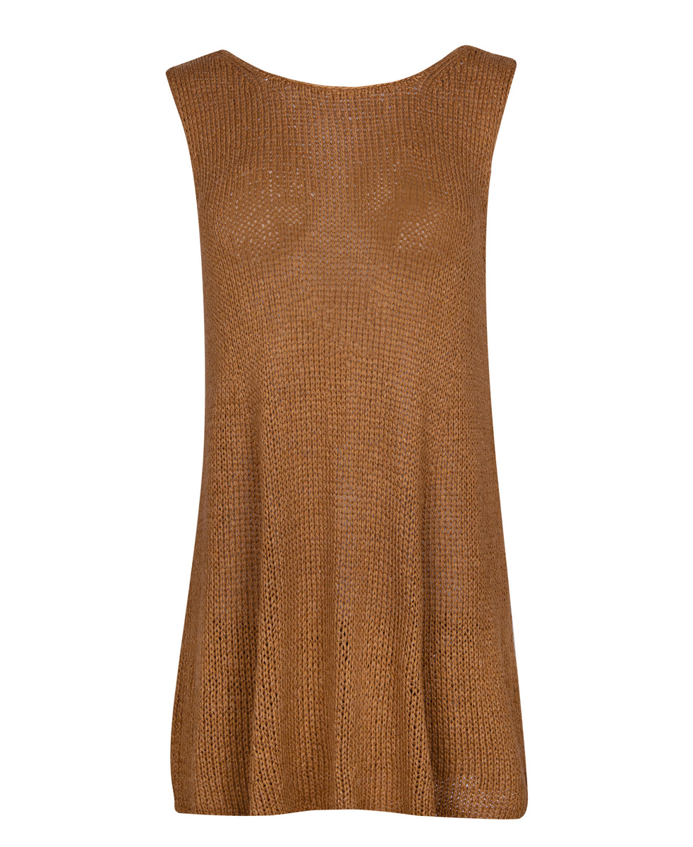 350 (400) g of Lana Grossa Solo Lino Mélange (80% recycled linen [viscose], 20% linen; 105 m/50 g) in Cinnamon Mélange (col 122). Size 5 and 6 mm needles; size 5 mm circular needle, 50 cm long
