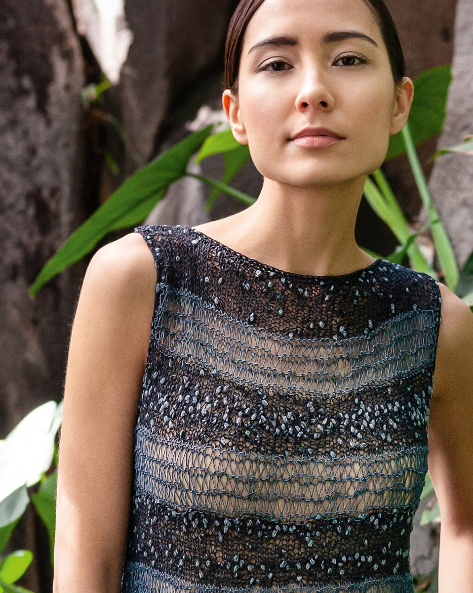 150 (200) g of Lana Grossa Stromboli (60% cotton, 15% viscose, 15% polyamide, 10% silk; 150 m/50 g in Black-Blue/Grey-Blue (col 110) and 100 (150) g of Lana Grossa Capri (55% cotton, 30% polyamide, 15% silk; 150 m/50 g) in Ocean Blue (col 15). Size 5 mm circular needles, 60 and 100 cm long; size 3.5 mm crochet hook