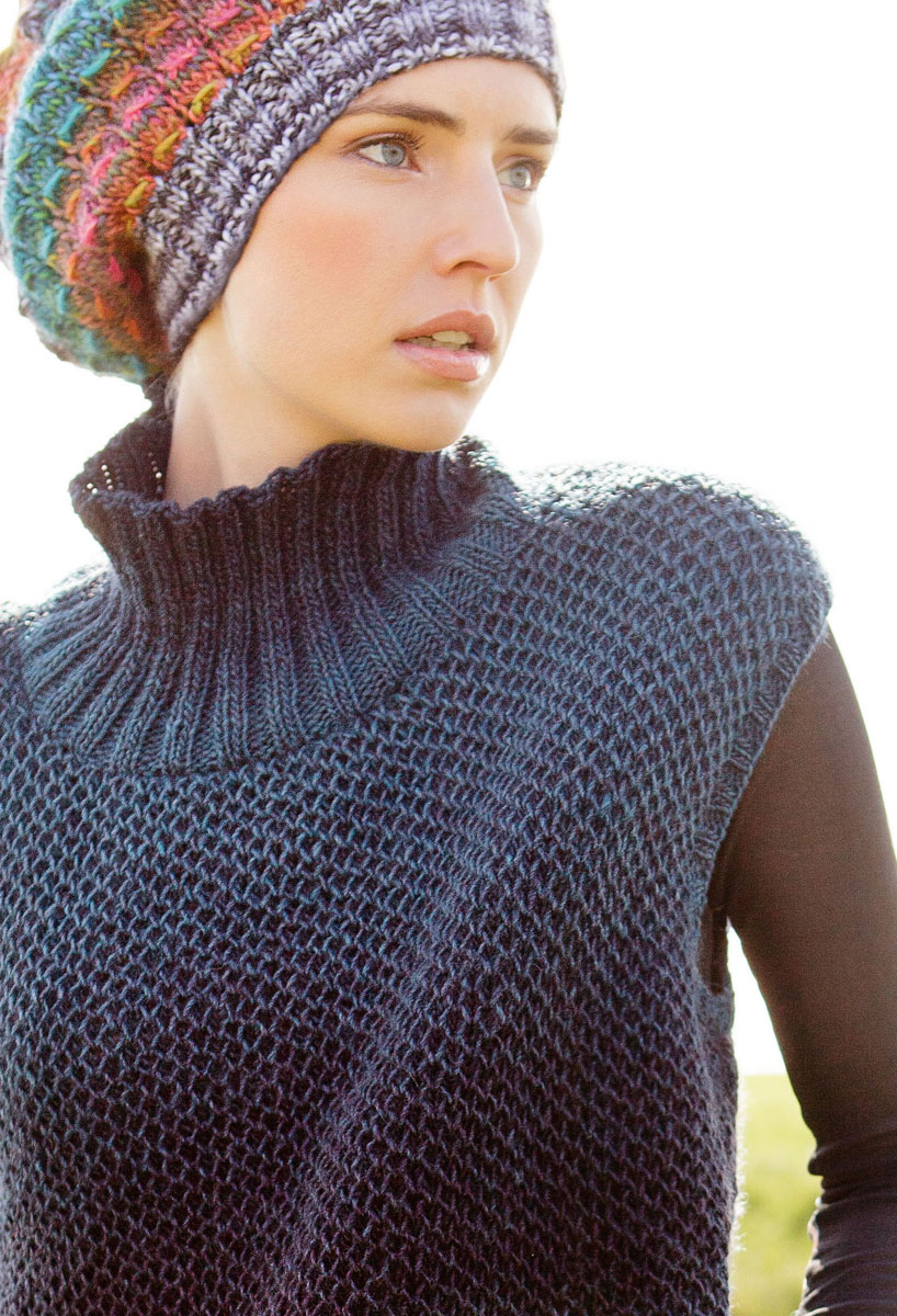 400 g of Lana Grossa Gomitolo 200 Dégradé (50% pure wool, 50% acrylic; 700 m/200 g) in Dark Blue/Petrol (col 307). Size 4.5 and 5 mm needles; size 4.5 mm circular needles, 40 and 60 cm long