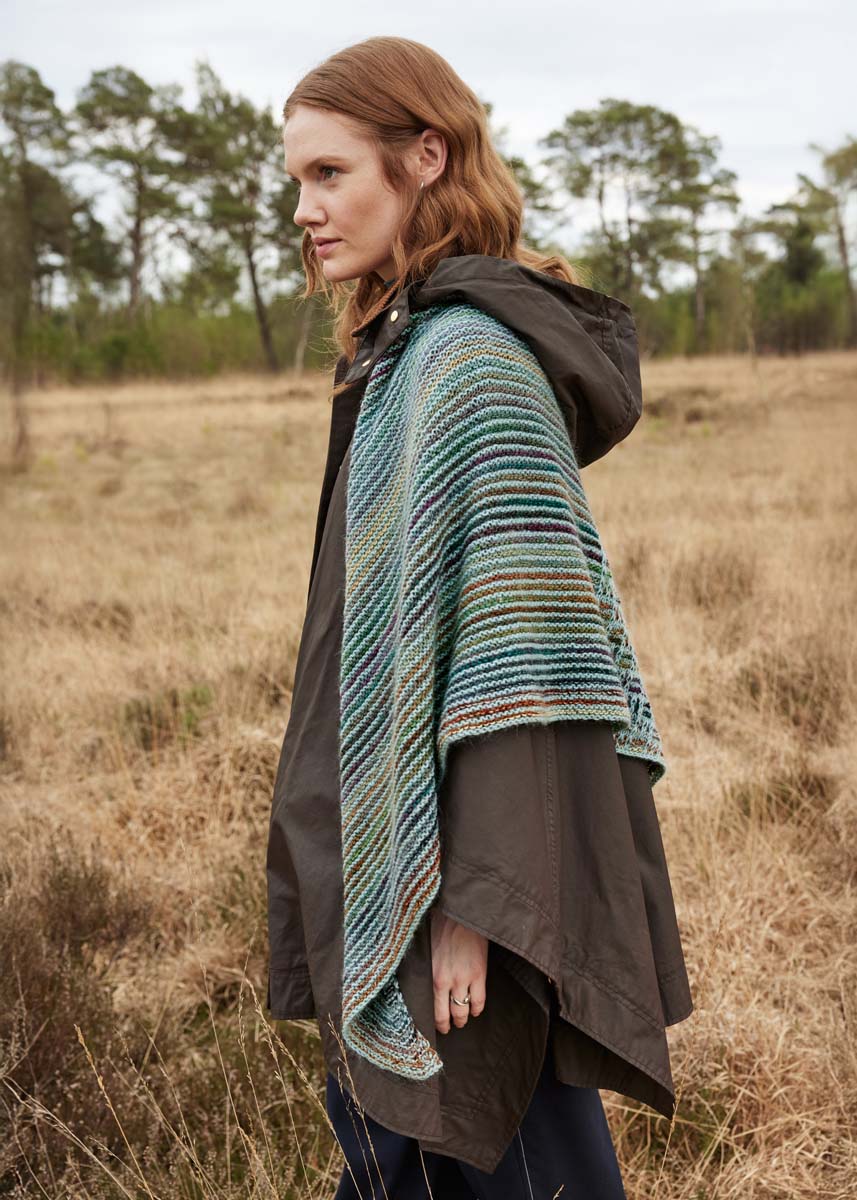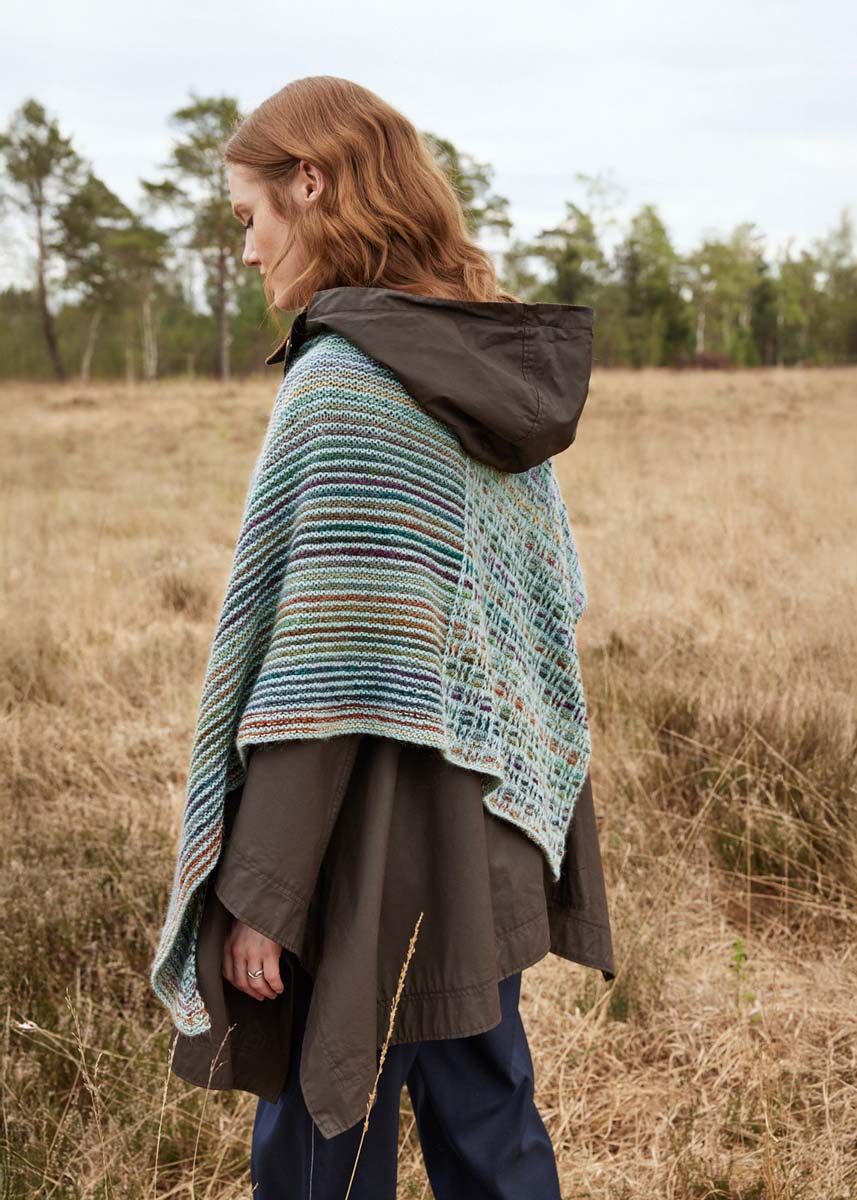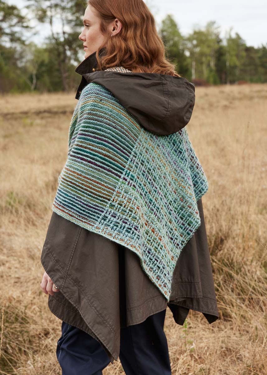 200 g of Lana Grossa Colorissimo (100% fine Merino wool; 300 m/100 g) in Light Green/Green/Petrol/Dark Petrol/Red Brown/Chocolate Brown/Burgundy/Grey (col 216); 150 g of Lana Grossa Ecopuno (72% cotton, 17% Merino wool, 11% baby alpaca; 215 m/50 g) in Mint Turquoise (col 44); 75 g of Lana Grossa Silkhair (70% Mohair (Superkid), 30% Seide, Lauflänge 210 m/25 g), in Pastel Green (Fb. 186). Size 4 – 4.5 mm circular needle, 100 cm long.