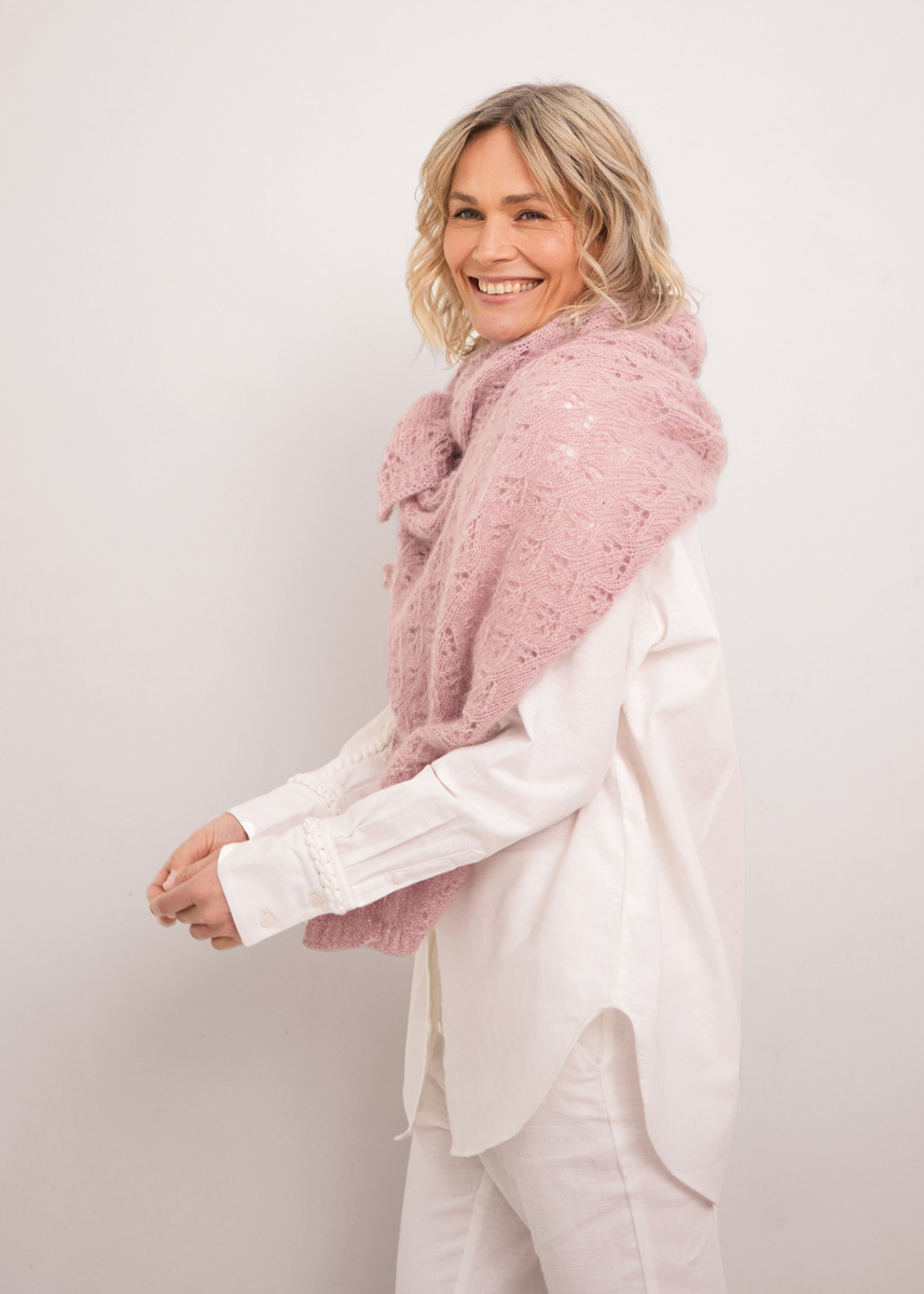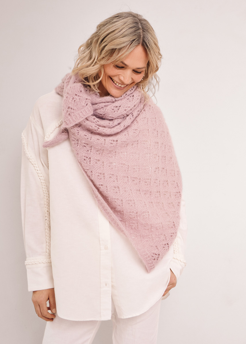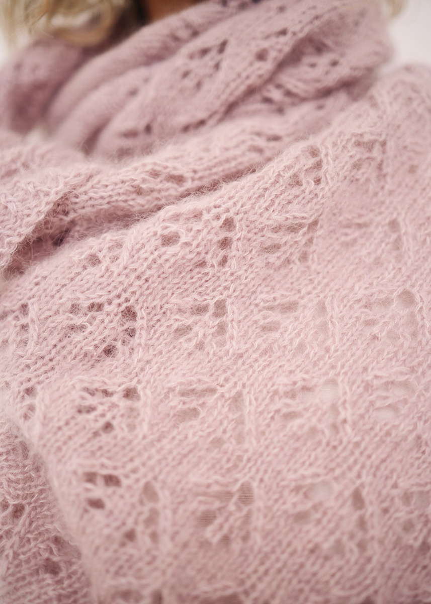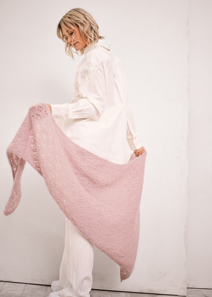 150 g of Lana Grossa Cool Wool Lace (100% extrafine Merino wool; 400 m/50 g) in Lilac (col 15) and 125 g of Lana Grossa Silkhair (70% superkid mohair, 30% silk; 210 m/25 g) in Pastel Lilac (col 150). Size 5 mm circular needle, 80 cm long.