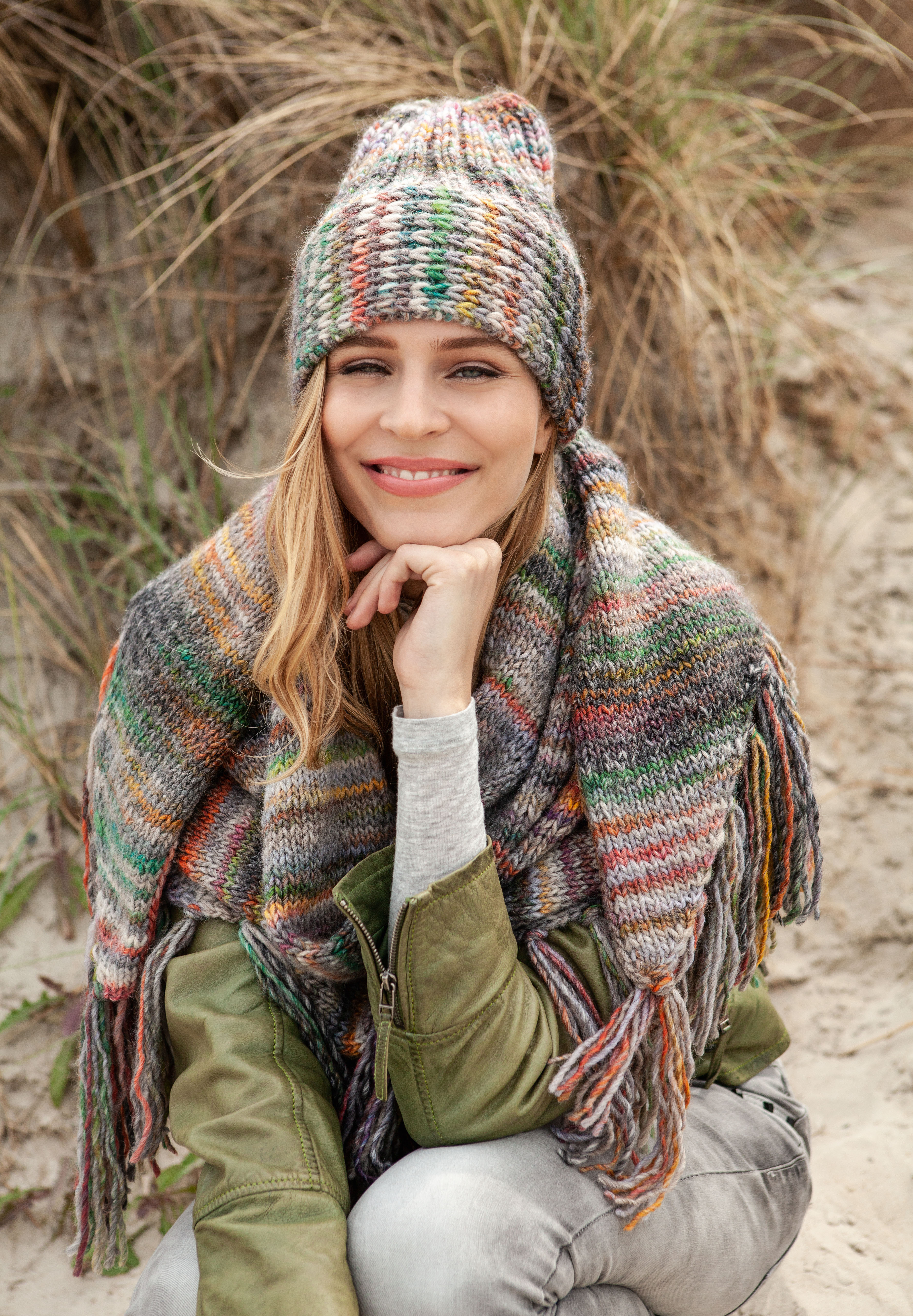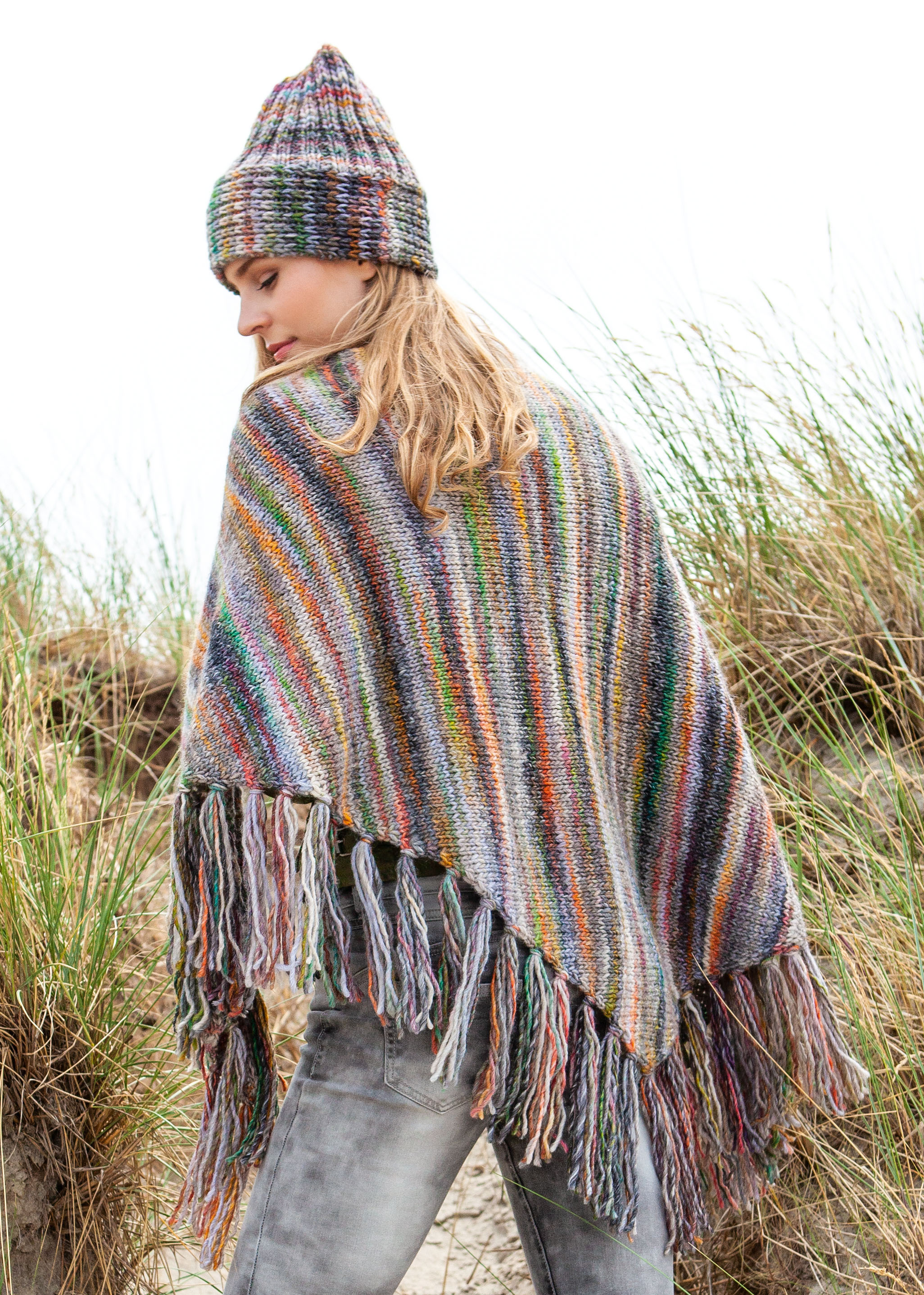 400 g of Lana Grossa Gomitolo Mezzo (50% pure wool, 50% acrylic; 90 m/50 g) in Taupe/Antique Pink/Yellow-Green/Orange/Salmon/Turquoise Blue/Purple/Coral (col 103). Size 6 mm needles; size 5.5 mm crochet hook